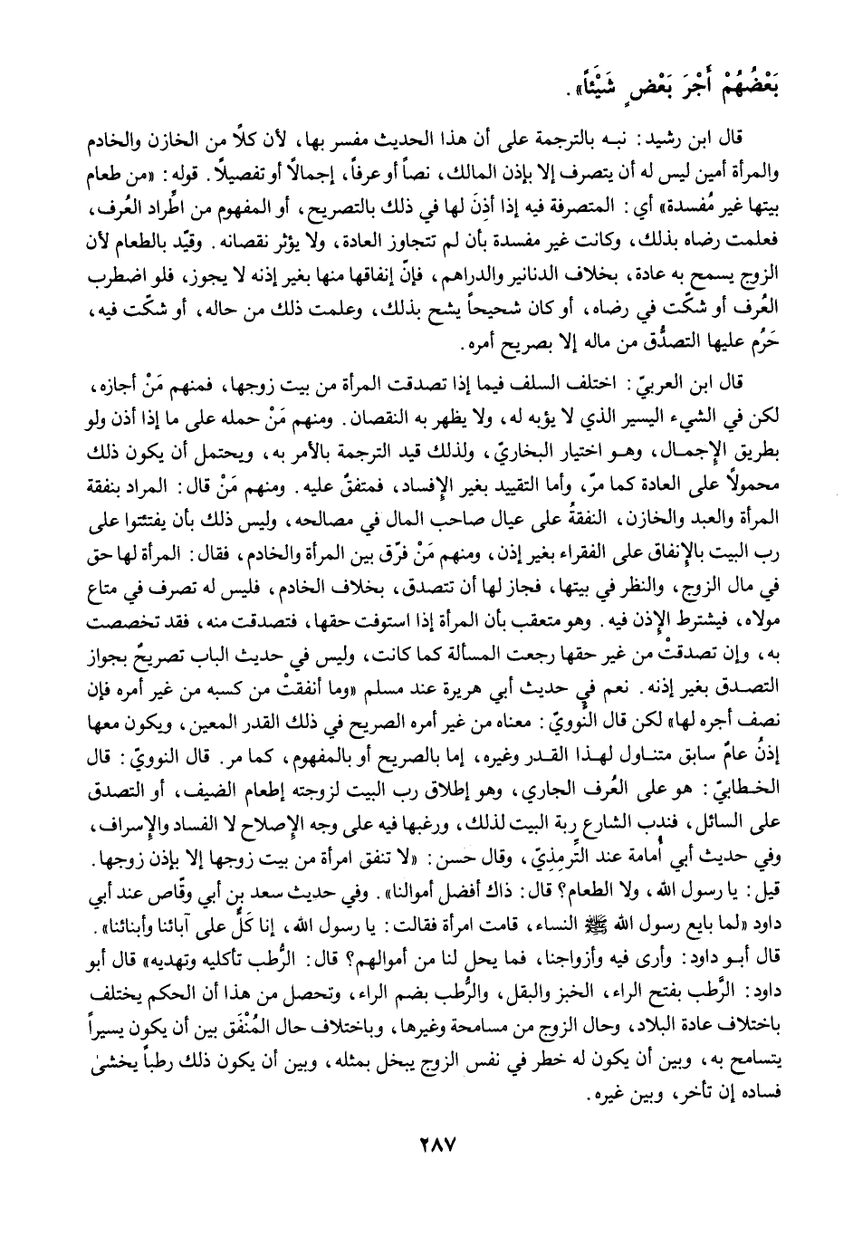 قال ابن العربيّ: اختلف السلف فيما إذا تصدقت المرأة من بيت زوجها، فمنهم مَنْ أجازه، لكن في الشيء اليسير الذي لا يؤبه له، ولا يظهر به النقصان. ومنهم مَنْ حمله على ما إذا أذن ولو بطريق الإجمال، وهو اختيار البخاريّ، ولذلك قيد الترجمة بالأمر به، ويحتمل أن يكون ذلك محمولًا على العادة كما مرَّ، وأما التقييد بغير الإفساد، فمتفقٌ عليه. ومنهم مَنْ قال: المراد بنفقة المرأة والعبد والخازن، النفقةُ على عيال صاحب المال في مصالحه، وليس ذلك بأن يفتئتوا على رب البيت بالإنفاق على الفقراء بغير إذن، ومنهم مَنْ فرّق بين المرأة والخادم، فقال: المرأة لها حق في مال الزوج، والنظر في بيتها، فجاز لها أن تتصدق، بخلاف الخادم، فليس له تصرف في متاع مولاه، فيشترط الإذن فيه. وهو متعقب بأن المرأة إذا استوفت حقها، فتصدقت منه، فقد تخصصت به، وإن تصدقتْ من غير حقها رجعت المسألة كما كانت، وليس في حديث الباب تصريحٌ بجواز التصدق بغير إذنه. نعم في حديث أبي هريرة عند مسلم "وما أنفقتْ من كسبه من غير أمره فإن نصف أجره لها" لكن قال النّوويّ: معناه من غير أمره الصريح في ذلك القدر المعين، ويكون معها إذنُ عامٌ سابق متناول لهذا القدر وغيره، إما بالصريح أو بالمفهوم، كما مرَّ. قال النوويّ: قال الخطابيّ: هو على العُرف البخاري، وهو إطلاق رب البيت لزوجته إطعام الضيف، أو التصدق على السائل، فندب الشارع ربة البيت لذلك، ورغبها فيه على وجه الإصلاح لا الفساد والإسراف، وفي حديث أبي أُمامة عند التِّرمِذِيّ، وقال حسن: "لا تنفق امرأة من بيت زوجها إلا بإذن زوجها. قيل: يا رسول الله، ولا الطعام؟ قال: ذاك أفضل أموالنا". وفي حديث سعد بن أبي وقاص عند أبي داود "لما بايع رسول الله -صلى الله عليه وسلم- النساء، قامت امرأة فقالت: يا رسول الله، إنا كَلٌّ على آبائنا وأبنائنا". قال أبو داود؟ وأرى فيه وأزواجنا، فما يحل لنا من أموالهم؟ قال: الرُّطب تأكليه وتهديه" قال أبو داود: الرطب بفتح الراء، الخبز والبقل، والرُّطب بضم الراء، وتحصل من هذا أن الحكم يختلف باختلاف عادة البلاد، وحال الزوج من مسامحة وغيرها، وباختلاف حال المنْفَق بين أن يكون يسيرًا يتسامح به، وبين أن يكون له خطر في نفس الزوج يبخل بمثله، وبين أن يكون ذلك رطبًا يخشى فساده إن تأخر، وبين غيره.