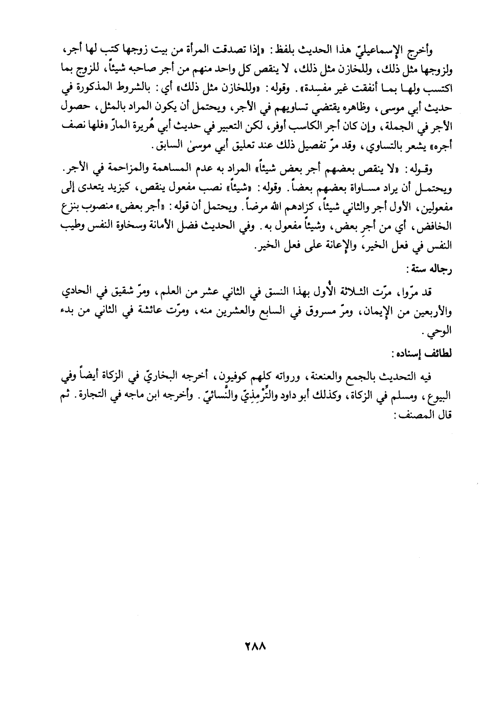 وأخرج الإسماعيليّ هذا الحديث بلفظ: "إذا تصدقت المرأة من بيت زوجها كتب لها أجر، ولزوجها مثل ذلك، وللخازن مثل ذلك، لا ينقص كل واحد منهم من أجر صاحبه شيئًا، للزوج بما اكتسب ولها بما أنفقت غير مفسِدة". وقوله: "وللخازن مثل ذلك" أي: بالشروط المذكورة في حديث أبي موسى، وظاهره يقتضي تساويهم في الأجر، ويحتمل أن يكون المراد بالمثل، حصول الأجر في الجملة، وإن كان أجر الكاسب أوفر، لكن التعبير في حديث أبي هُريرة المارّ "فلها نصف أجره" يشعر بالتساوي، وقد مرَّ تفصيل ذلك عند تعليق أبي موسى السابق.