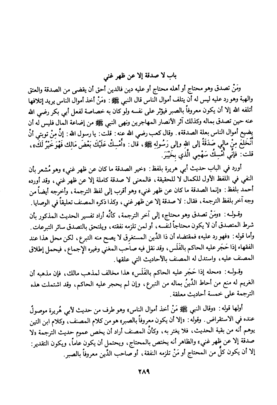 وقوله: "ومَنْ تصدق وهو محتاج" إلى آخر الترجمة، كأنَّه أراد تفسير الحديث المذكور بأن شرط المتصدق أن لا يكون محتاجًا لنفسه، أو لمن تلزمه نفقته، ويلتحق بالتصدق سائر التبرعات. وأما قوله: "فهو رد عليه" فمقتضاه أن ذا الدَّين المستغرِق لا يصح منه التبرع، لكن محل هذا عند الفقهاء إذا حَجَر عليه الحاكم بالفَلَس، وقد نقل فيه صاحب المغني وغيره الإجماع، فيحمل إطلاق المصنف عليه، واستدل له المصنف بالأحاديث التي علقها.