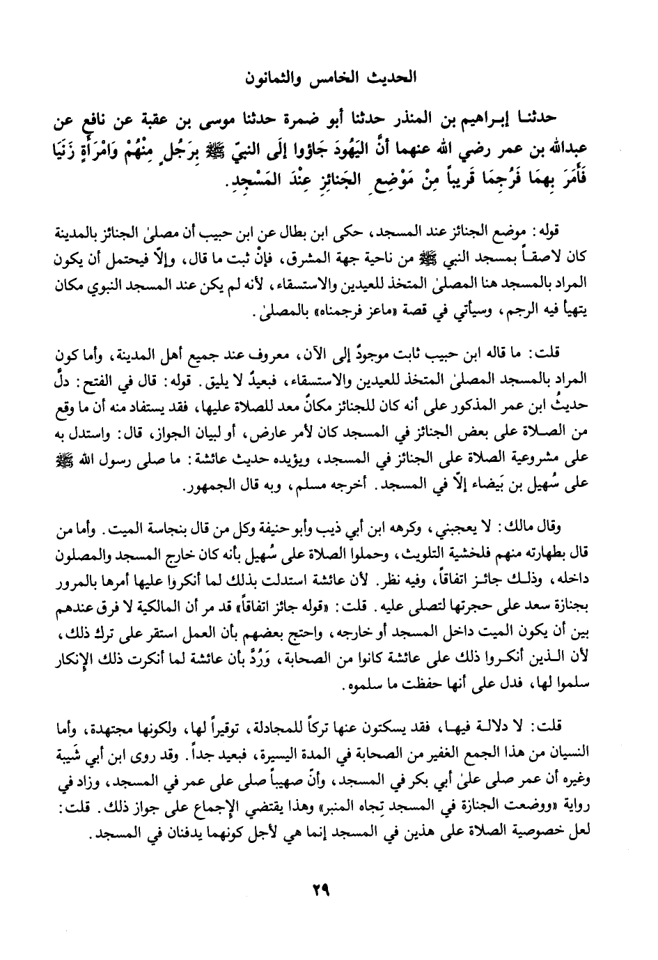 قلت: ما قاله ابن حبيب ثابت موجودٌ إلى الآن، معروف عند جميع أهل المدينة، وأما كون المراد بالمسجد المصلى المتخذ للعيدين والاستسقاء، فبعيدٌ لا يليق. قوله: قال في الفتح: دلَّ حديثُ ابن عمر المذكور على أنه كان للجنائز مكانٌ معد للصلاة عليها، فقد يستفاد منه أن ما وقع من الصلاة على بعض الجنائز في المسجد كان لأمر عارض، أو لبيان الجواز، قال: واستدل به على مشروعية الصلاة على الجنائز في المسجد، ويؤيده حديث عائشة: ما صلى رسول الله -صلى الله عليه وسلم- على سُهيل بن بَيضاء إلاّ في المسجد. أخرجه مسلم، وبه قال الجمهور.