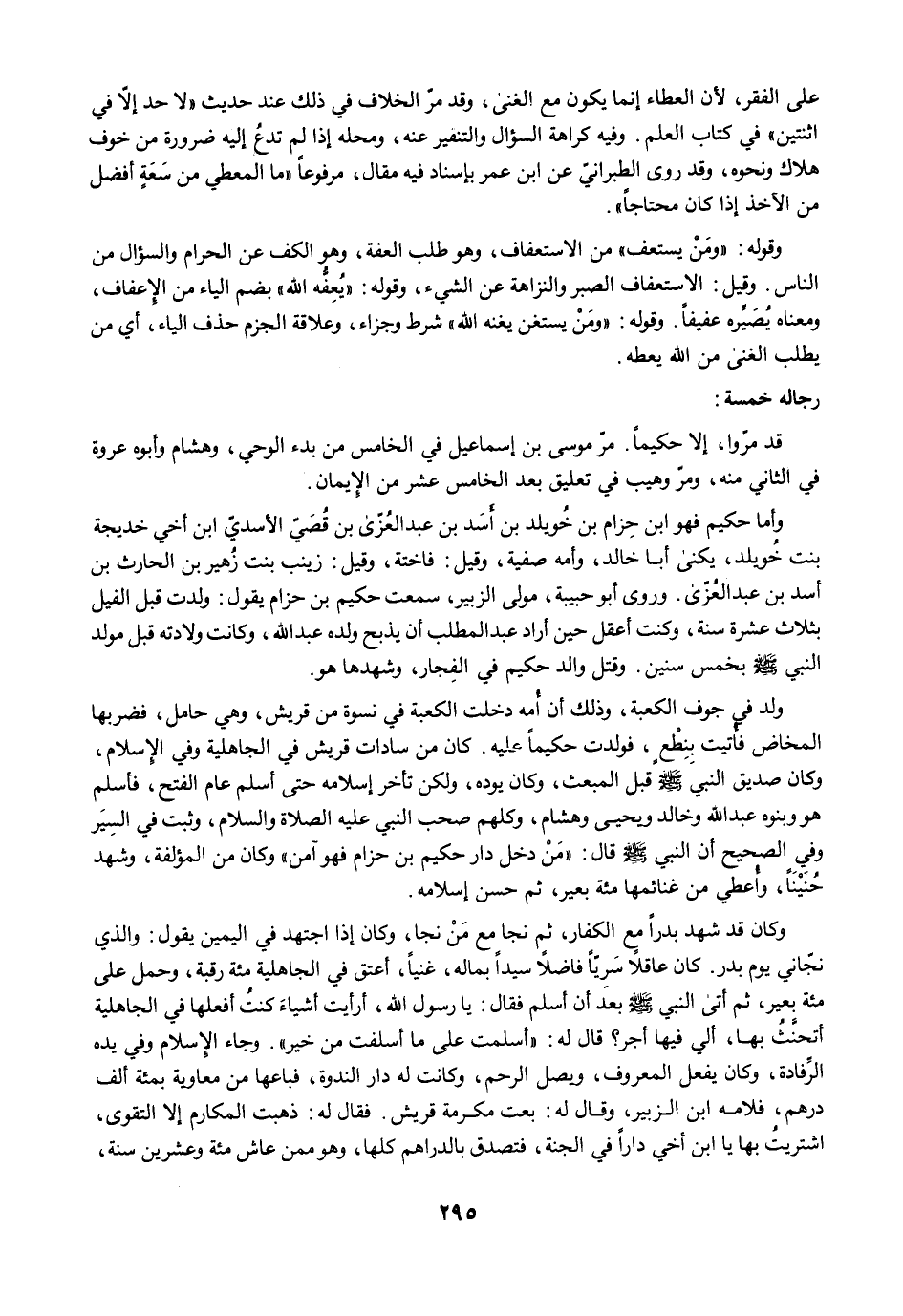وأما حكيم فهو ابن حِزام بن خُويلد بن أَسَد بن عبد العُزّى بن قُصَى الأسديّ ابن أخي خديجة بنت خُويلد، يكنى أبا خالد، وأمه صفية، وقيل: فاختة، وقيل: زينب بنت زُهير بن الحارث بن أسد بن عبد العُزّى. وروى أبو حبيبة، مولى الزبير، سمعت حكيم بن حزام يقول: ولدت قبل الفيل بثلاث عشرة سنة، وكنت أعقل حين أراد عبد المطلب أن يذبح ولده عبد الله، وكانت ولادته قبل مولد النبي -صلى الله عليه وسلم- بخمس سنين. وقتل والد حكيم في الفِجار، وشهدها هو.