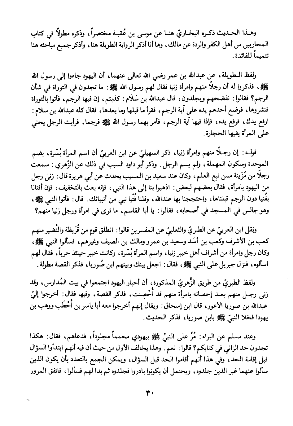 ولفظ الطويلة، عن عبد الله بن عمر رضي الله تعالى عنهما، أن اليهود جاءوا إلى رسول الله -صلى الله عليه وسلم-، فذكروا له أن رجلًا منهم وامرأة زنيا فقال لهم رسول الله -صلى الله عليه وسلم-: ما تجدون في التوراة في شأن الرجم؟ فقالوا: نفضحهم ويجلدون، قال عبد الله بن سَلاَم: كذبتم، إن فيها الرجم، فأتوا بالتوراة فنشروها، فوضع أحدهم يده على آية الرجم، فقرأ ما قبلها وما بعدها، فقال كله عبد الله بن سلام: ارفع يدك، فرفع يده، فإذا فيها آية الرجم، فأمر بهما رسول الله -صلى الله عليه وسلم- فرجما، فرأيت الرجل يحني على المرأة يقيها الحجارة.