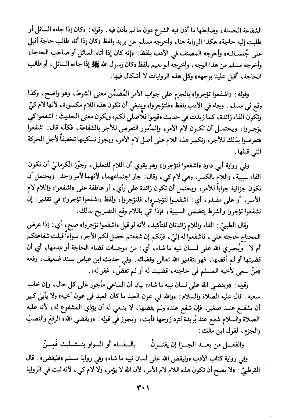 وقوله: "اشفعوا تؤجروا" بالجزم على جواب الأمر المُضَمَّن معنى الشرط، وهو واضح، وكذا وقع في مسلم. وجاء في الأدب بلفظ "فلتؤجروا" وينبغي أن تكون هذه اللام مكسورة؛ لأنها لام كيّ وتكون الفاء زائدة، كما زيدت في حديث "قوموا فلأُصلي لكم" ويكون معنى الحديث: اشفعوا كي يؤجروا، ويحتمل أن تكون لام الأمر، والمأمور التعرض للأجر بالشفاعة، فكأنه قال: اشفعوا فتعرضوا بذلك للأجر، وتكسر هذه اللام على أصل لام الأمر، ويجوز تسكينها تخفيفًا لأجل الحركة التي قبلها.