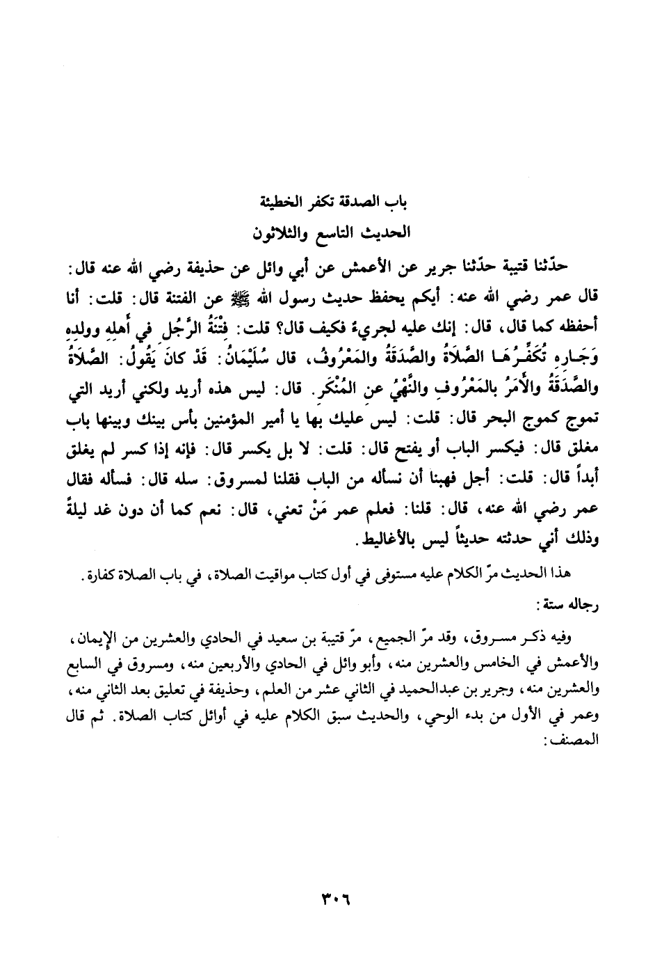 حَدَّثَنَا قُتَيْبَةُ حَدَّثَنَا جَرِيرٌ عَنِ الأَعْمَشِ عَنْ أَبِي وَائِلٍ عَنْ حُذَيْفَةَ رضي الله عنه قَالَ: قَالَ عُمَرُ رضي الله عنه: أَيُّكُمْ يَحْفَظُ حَدِيثَ رَسُولِ اللَّهِ -صلى الله عليه وسلم- عَنِ الْفِتْنَةِ قَالَ: قُلْتُ: أَنَا أَحْفَظُهُ كَمَا قَالَ. قَالَ: إِنَّكَ عَلَيْهِ لَجَرِيءٌ فَكَيْفَ قَالَ؟ قُلْتُ: فِتْنَةُ الرَّجُلِ فِي أَهْلِهِ وَوَلَدِهِ وَجَارِهِ تُكَفِّرُهَا الصَّلاَةُ وَالصَّدَقَةُ وَالْمَعْرُوفُ. قَالَ سُلَيْمَانُ: قَدْ كَانَ يَقُولُ: الصَّلاَةُ وَالصَّدَقَةُ، وَالأَمْرُ بِالْمَعْرُوفِ وَالنَّهْيُ عَنِ الْمُنْكَرِ. قَالَ: لَيْسَ هَذِهِ أُرِيدُ، وَلَكِنِّي أُرِيدُ الَّتِي تَمُوجُ كَمَوْجِ الْبَحْرِ. قَالَ: قُلْتُ: لَيْسَ عَلَيْكَ بِهَا يَا أَمِيرَ الْمُؤْمِنِينَ بَأْسٌ، بَيْنَكَ وَبَيْنَهَا بَابٌ مُغْلَقٌ. قَالَ: فَيُكْسَرُ الْبَابُ أَوْ يُفْتَحُ. قَالَ: قُلْتُ: لاَ. بَلْ يُكْسَرُ. قَالَ: فَإِنَّهُ إِذَا كُسِرَ لَمْ يُغْلَقْ أَبَدًا. قَالَ: قُلْتُ: أَجَلْ. فَهِبْنَا أَنْ نَسْأَلَهُ مَنِ الْبَابُ فَقُلْنَا لِمَسْرُوقٍ: سَلْهُ. قَالَ: فَسَأَلَهُ. فَقَالَ عُمَرُ رضي الله عنه. قَالَ: قُلْنَا: فَعَلِمَ عُمَرُ مَنْ تَعْنِي، قَالَ: نَعَمْ، كَمَا أَنَّ دُونَ غَدٍ لَيْلَةً، وَذَلِكَ أَنِّي حَدَّثْتُهُ حَدِيثًا لَيْسَ بِالأَغَالِيطِ.