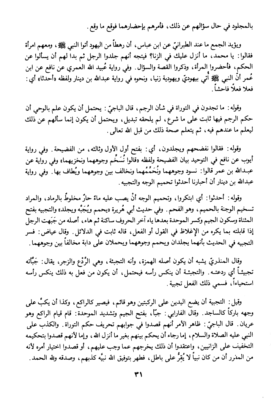 وقيل: التجبية أن يضع اليدين على الركبتين وهو قائم، فيصير كالراكع، وكذا أن يكبَّ على وجهه باركًا كالساجد. وقال الفارابي: جبّأ، بفتح الجيم وتشديد الموحدة: قام قيام الراكع وهو عريان. قال الباجيّ: ظاهر الأمر أنهم قصدوا في جوابهم تحريف حكم التوراة. والكذب على النبي عليه الصلاة والسلام، إما رجاء أن يحكم بينهم بغير ما أنزل الله، وإما لأنهم قصدوا بتحكيمه التخفيف على الزانيين، واعتقدوا أن ذلك يخرجهم عما وجب عليهم، أو قصدوا اختيار أمره لأنه من المقرر أن من كان نبيًا لا يُقِرُّ على باطل، فطهر بتوفيق الله نبيَّه كذبهم، وصدقه ولله الحمد.
