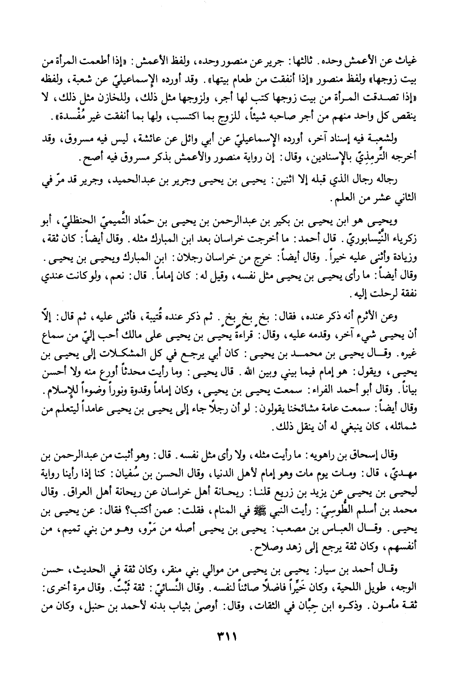 ويحيى هو ابن يحيى بن بكير بن عبد الرحمن بن يحيى بن حمّاد التَّميميّ الحنظليّ، أبو زكرياء النَّيْسابوريّ. قال أحمد: ما أخرجت خراسان بعد ابن المبارك مثله. وقال أيضًا: كان ثقة، وزيادة وأثنى عليه خيرًا. وقال أيضًا: خرج من خراسان رجلان: ابن المبارك ويحيى بن يحيى. وقال أيضًا: ما رأى يحيى بن يحيى مثل نفسه، وقيل له: كان إمامًا. قال: نعم، ولو كانت عندي نفقة لرحلت إليه.