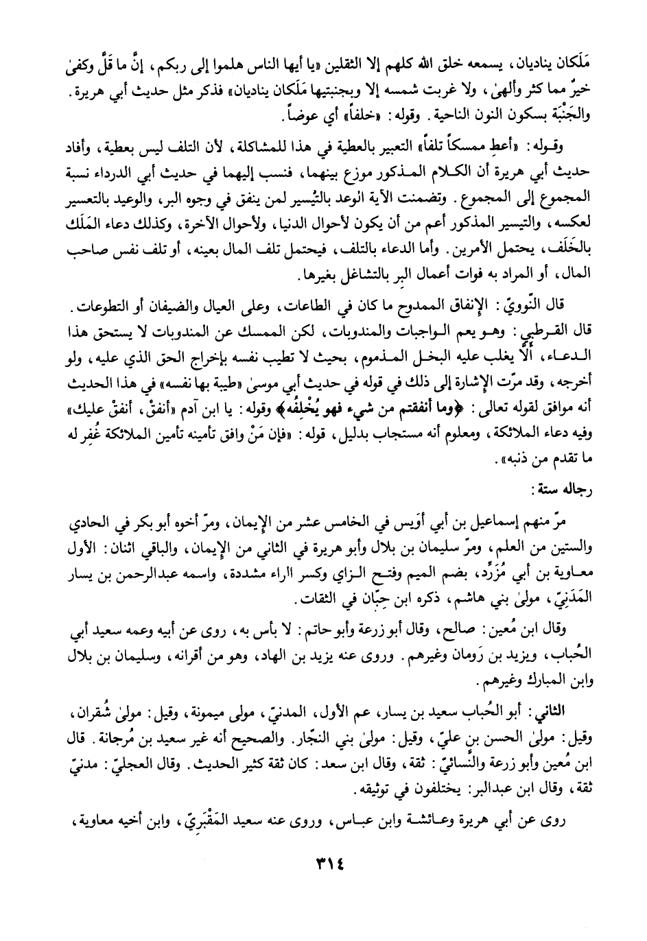 وقوله: "أعطِ ممسكًا تلفًا" التعبير بالعطية في هذا للمشاكلة، لأن التلف ليس بعطية، وأفاد حديث أبي هريرة أن الكلام المذكور موزع بينهما، فنسب إليهما في حديث أبي الدرداء نسبة المجموع إلى المجموع. وتضمنت الآية الوعد بالتيّسير لمن ينفق في وجوه البر، والوعيد بالتعسير لعكسه، والتيسير المذكور أعم من أن يكون لأحوال الدنيا، ولأحوال الآخرة، وكذلك دعاء المَلَك بالخَلَف، يحتمل الأمرين. وأما الدعاء بالتلف، فيحتمل تلف المال بعينه، أو تلف نفس صاحب المال، أو المراد به فوات أعمال البِر بالتشاغل بغيرها.