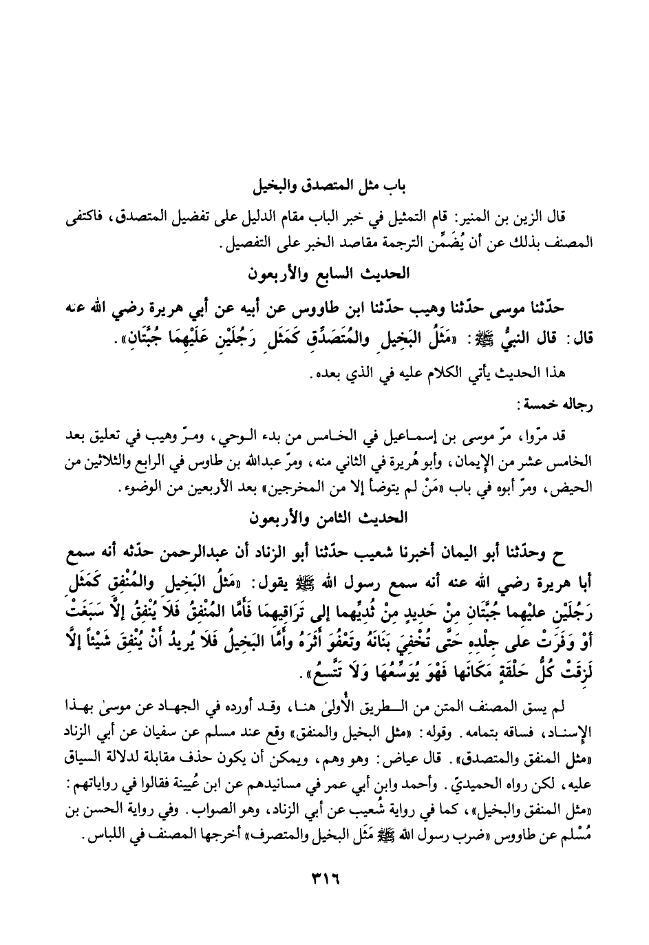 ح وَحَدَّثَنَا أَبُو الْيَمَانِ أَخْبَرَنَا شُعَيْبٌ حَدَّثَنَا أَبُو الزِّنَادِ أَنَّ عَبْدَ الرَّحْمَنِ حَدَّثَهُ أَنَّهُ سَمِعَ أَبَا هُرَيْرَةَ رضي الله عنه أَنَّهُ سَمِعَ رَسُولَ اللَّهِ -صلى الله عليه وسلم- يَقُولُ: "مَثَلُ الْبَخِيلِ وَالْمُنْفِقِ كَمَثَلِ رَجُلَيْنِ، عَلَيْهِمَا جُبَّتَانِ مِنْ حَدِيدٍ، مِنْ ثُدِيِّهِمَا إِلَى تَرَاقِيهِمَا، فَأَمَّا الْمُنْفِقُ فَلاَ يُنْفِقُ إِلاَّ سَبَغَتْ أَوْ وَفَرَتْ عَلَى جِلْدِهِ حَتَّى تُخْفِيَ بَنَانَهُ وَتَعْفُوَ أَثَرَهُ، وَأَمَّا الْبَخِيلُ فَلاَ يُرِيدُ أَنْ يُنْفِقَ شَيْئًا إِلاَّ لَزِقَتْ كُلُّ حَلْقَةٍ مَكَانَهَا، فَهُوَ يُوَسِّعُهَا وَلاَ تَتَّسِعُ".