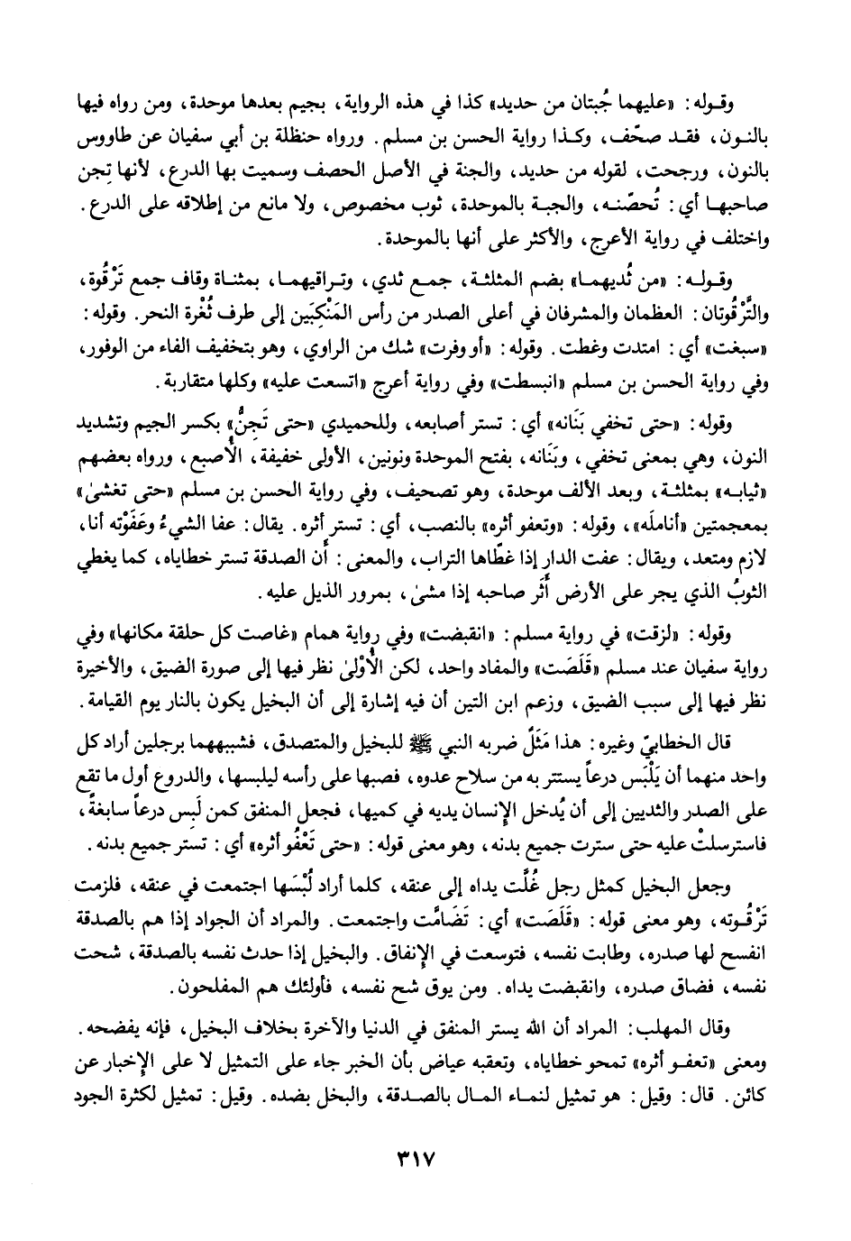 وقوله: "من ثُديهما" بضم المثلثة، جمع ثدي، وتراقيهما، بمثناة وقاف جمع تَرْقُوة، والتَّرْقُوتان: العظمان والمشرفان في أعلى الصدر من رأس المَنْكِبَين إلى طرف ثُغْرة النحر. وقوله: "سبغت" أي: امتدت وغطت. وقوله: "أو وفرت" شك من الراوي، وهو بتخفيف الفاء من الوفور، وفي رواية الحسن بن مسلم "انبسطت" وفي رواية أعرج "اتسعت عليه" وكلها متقاربة.
