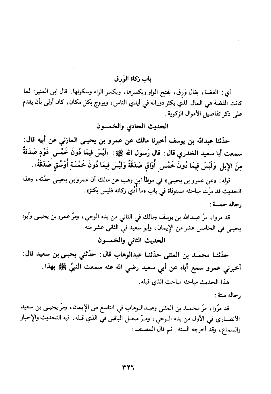 حَدَّثَنَا عَبْدُ اللَّهِ بْنُ يُوسُفَ أَخْبَرَنَا مَالِكٌ عَنْ عَمْرِو بْنِ يَحْيَى الْمَازِنِيِّ عَنْ أَبِيهِ قَالَ: سَمِعْتُ أَبَا سَعِيدٍ الْخُدْرِيَّ قَالَ: قَالَ رَسُولُ اللَّهِ -صلى الله عليه وسلم-: "لَيْسَ فِيمَا دُونَ خَمْسِ ذَوْدٍ صَدَقَةٌ مِنَ الإِبِلِ، وَلَيْسَ فِيمَا دُونَ خَمْسِ أَوَاقٍ صَدَقَةٌ، وَلَيْسَ فِيمَا دُونَ خَمْسَةِ أَوْسُقٍ صَدَقَةٌ".
