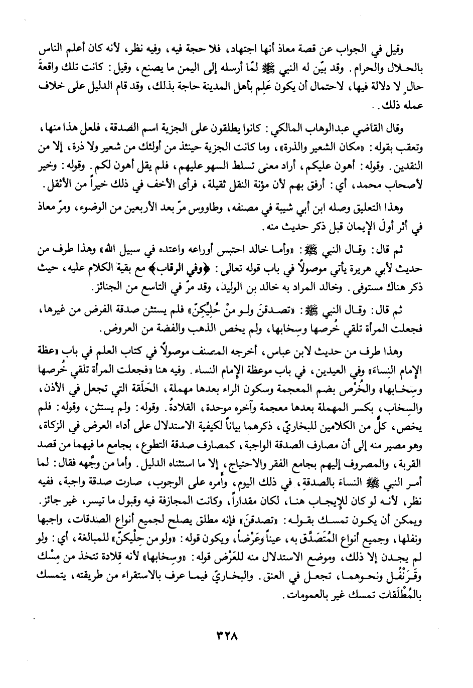 وهذا طرف من حديث لابن عباس، أخرجه المصنف موصولًا في كتاب العلم في باب "عظة الإِمام النِساءَ" وفي العيدين، في باب موعظة الإمام النساء. وفيه هنا "فجعلت المرأة تلقي خُرصها وسِخابها" والخُرْص بضم المعجمة وسكون الراء بعدها مهملة، الحَلَقة التي تجعل في الأذن، والسِخاب، بكسر المهملة بعدها معجمة وآخره موحدة، القلادةُ. وقوله: ولم يستثن، وقوله: فلم يخص، كلُّ من الكلامين للبخاريّ، ذكرهما بيانًا لكيفية الاستدلال على أداء العرض في الزكاة، وهو مصير منه إلى أن مصارف الصدقة الواجبة، كمصارف صدقة التطوع، بجامع ما فيهما من قصد القربة، والمصروف إليهم بجامع الفقر والاحتياج، إلا ما استثناه الدليل. وأما من وجَّهه فقال: لما أمرّ النبي -صلى الله عليه وسلم- النساءَ بالصدقةِ، في ذلك اليوم، وأَمره على الوجوب، صارت صدقة واجبة، ففيه نظر، لأنه لو كان للإيجاب هنا، لكان مقدارًا، وكانت المجازفة فيه وقبول ما تيسر، غير جائز. ويمكن أن يكون تمسك بقوله: "تصدقنَ" فإنه مطلق يصلح لجميع أنواع الصدقات، واجبها ونفلها، وجميع أنواع المُتَصَدَّق به، عينًا وعَرْضًا، ويكون قوله: "ولو من حِلْيكنّ" للمبالغة، أي: ولو لم يجدن إلا ذلك، وموضع الاستدلال منه للعَرْض قوله: "وسِخابها" لأنه قِلادة تتخذ من مِسْك وقَرَنْفُل ونحوهما، تجعل في العنق. والبخاريّ فيما عرف بالاستقراء من طريقته، يتمسك بالمُطْلَقات تمسك غير بالعمومات.