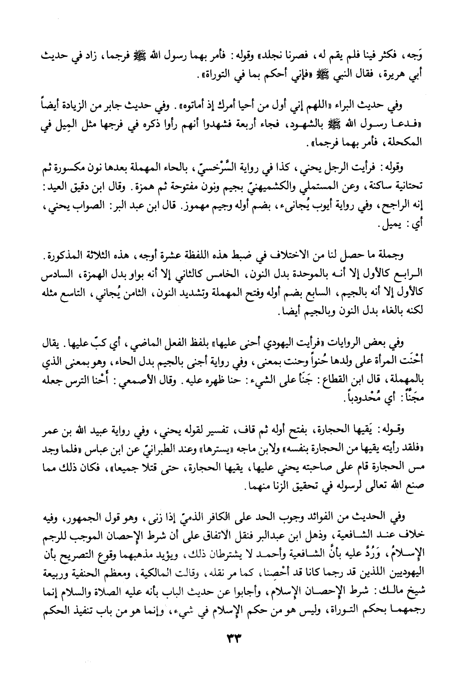 وفي حديث البراء "اللهم إني أول من أحيا أمرك إذ أماتوه". وفي حديث جابر من الزيادة أيضًا "فدعا رسول الله -صلى الله عليه وسلم- بالشهود، فجاء أربعة فشهدوا أنهم رأوا ذكره في فرجها مثل المِيل في المكحلة، فأمر بهما فرجما".