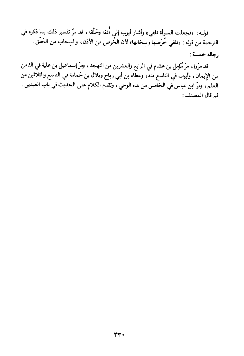 قد مرّوا، مرّ مُؤَمل بن هشام في الرابع والعشرين من التهجد، ومرّ إسماعيل بن علية في الثامن من الإيمان، وأيوب في التاسع منه، وعطاء بن أبي رباح وبلال بن حَمامة في التاسع والثلاثين من العلم، ومرّ ابن عباس في الخامس من بدء الوحي، وتقدم الكلام على الحديث في باب العيدين. ثم قال المصنف: