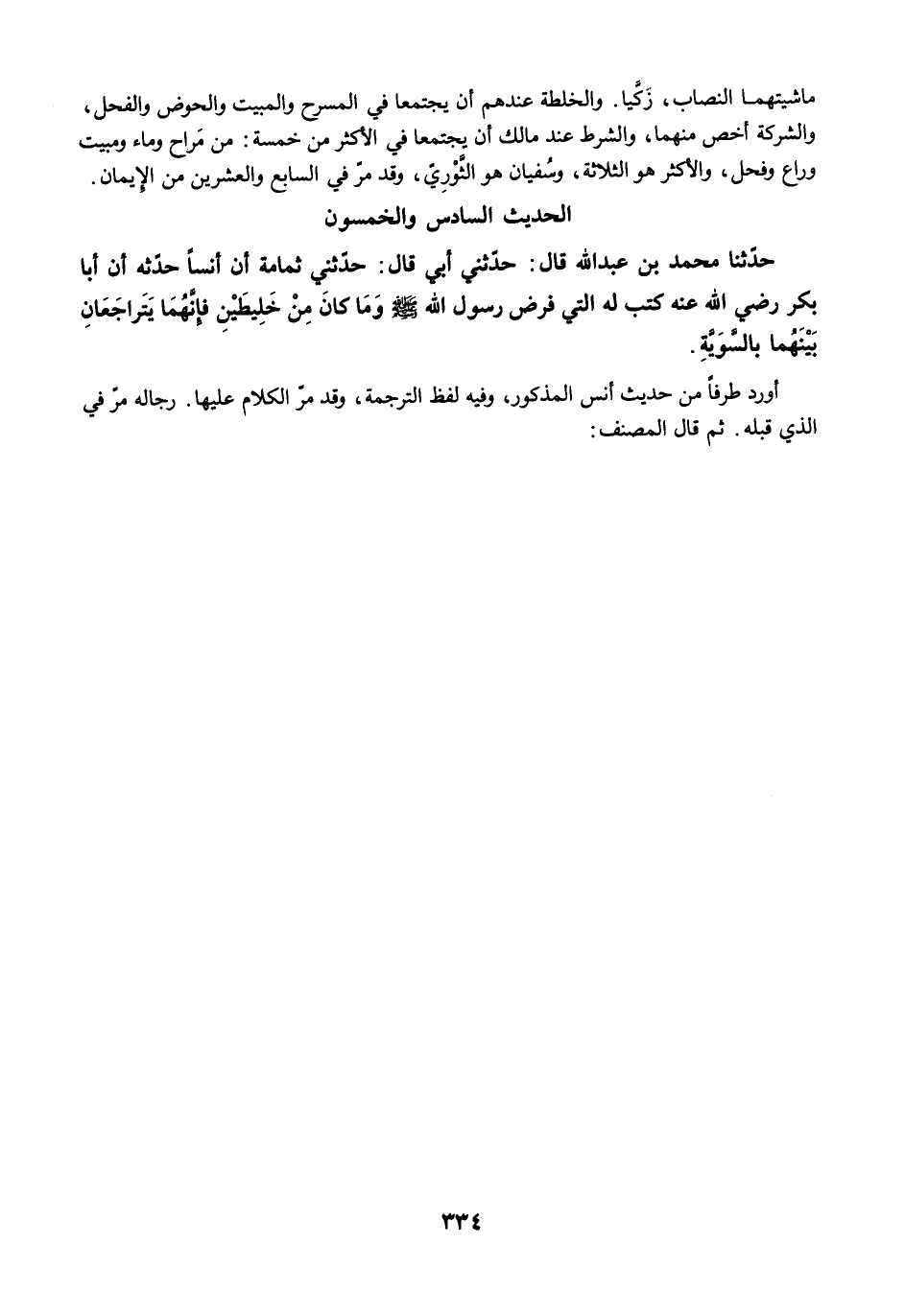 حَدَّثَنَا مُحَمَّدُ بْنُ عَبْدِ اللَّهِ قَالَ: حَدَّثَنِي أَبِي قَالَ: حَدَّثَنِي ثُمَامَةُ أَنَّ أَنَسًا حَدَّثَهُ أَنَّ أَبَا بَكْرٍ رضي الله عنه كَتَبَ لَهُ الَّتِي فَرَضَ رَسُولُ اللَّهِ -صلى الله عليه وسلم- وَمَا كَانَ مِنْ خَلِيطَيْنِ فَإِنَّهُمَا يَتَرَاجَعَانِ بَيْنَهُمَا بِالسَّوِيَّةِ.