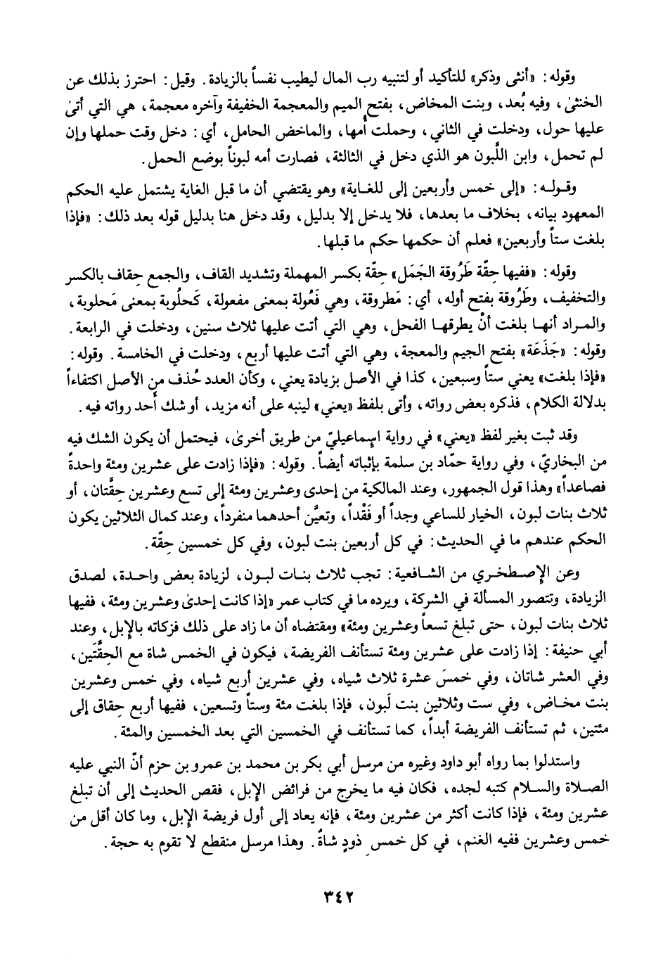 واستدلوا بما رواه أبو داود وغيره من مرسل أبي بكر بن محمد بن عمرو بن حزم أنّ النبي عليه الصلاة والسلام كتبه لجده، فكان فيه ما يخرج من فرائض الإبل، فقص الحديث إلى أن تبلغ عشرين ومئة، فإذا كانت أكثر من عشرين ومئة، فإنه يعاد إلى أول فريضة الإبل، وما كان أقل من خمس وعشرين ففيه الغنم، في كل خمسِ ذودٍ شاةٌ. وهذا مرسل منقطع لا تقوم به حجة.