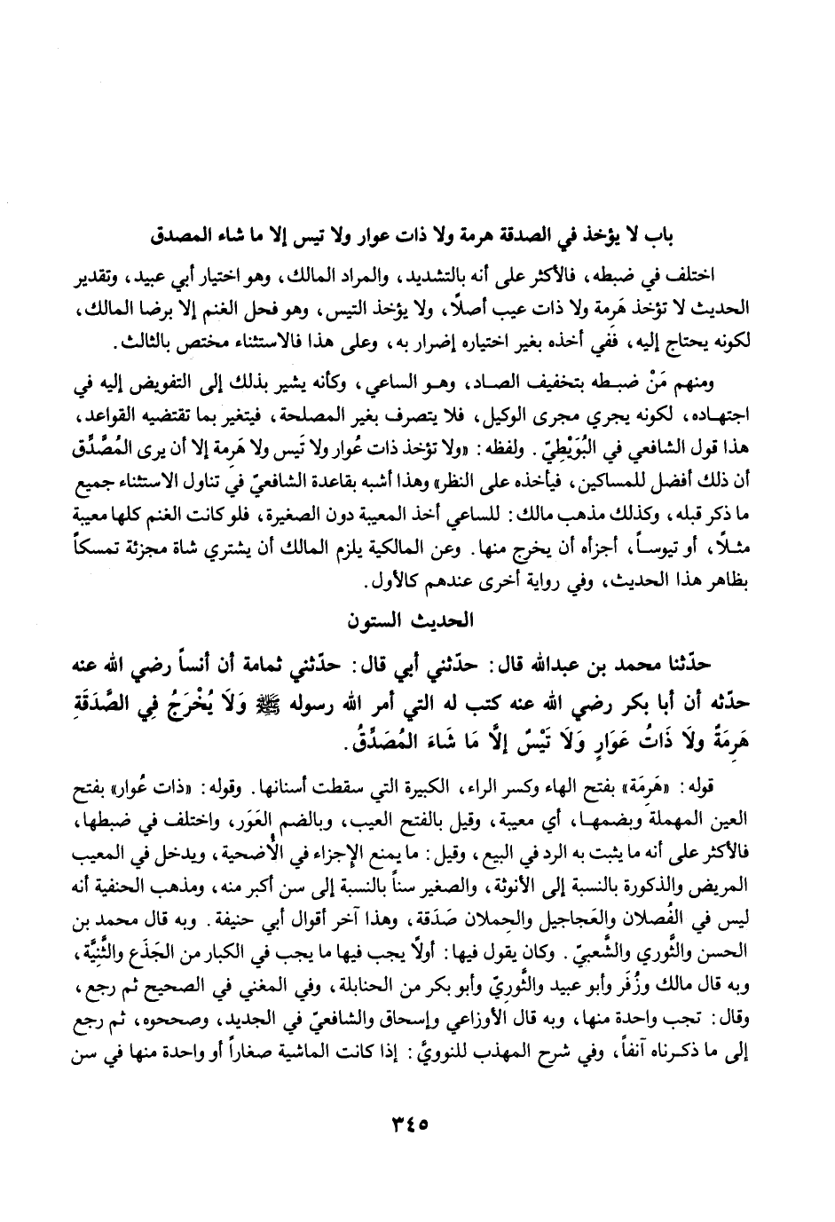 حَدَّثَنَا مُحَمَّدُ بْنُ عَبْدِ اللَّهِ قَالَ: حَدَّثَنِي أَبِي قَالَ: حَدَّثَنِي ثُمَامَةُ أَنَّ أَنَسًا رضي الله عنه حَدَّثَهُ أَنَّ أَبَا بَكْرٍ رضي الله عنه كَتَبَ لَهُ الَّتِي أَمَرَ اللَّهُ رَسُولَهُ -صلى الله عليه وسلم- وَلاَ يُخْرَجُ فِي الصَّدَقَةِ هَرِمَةٌ، وَلاَ ذَاتُ عَوَارٍ، وَلاَ تَيْسٌ، إِلاَّ مَا شَاءَ الْمُصَدِّقُ.