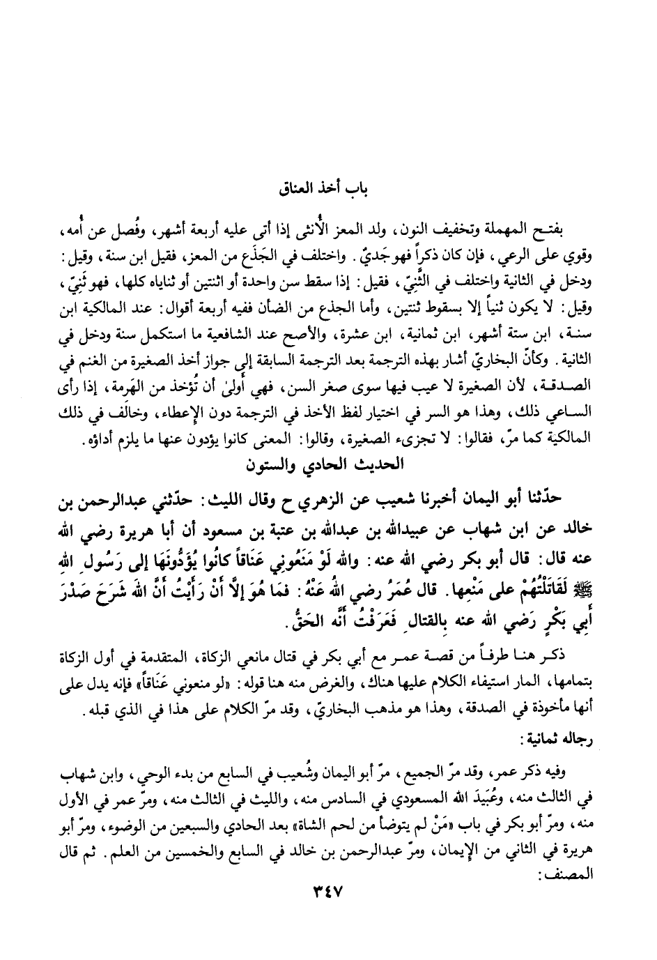حَدَّثَنَا أَبُو الْيَمَانِ أَخْبَرَنَا شُعَيْبٌ عَنِ الزُّهْرِيِّ ح وَقَالَ اللَّيْثُ: حَدَّثَنِي عَبْدُ الرَّحْمَنِ بْنُ خَالِدٍ عَنِ ابْنِ شِهَابٍ عَنْ عُبَيْدِ اللَّهِ بْنِ عَبْدِ اللَّهِ بْنِ عُتْبَةَ بْنِ مَسْعُودٍ أَنَّ أَبَا هُرَيْرَةَ رضي الله عنه قَالَ: قَالَ أَبُو بَكْرٍ رضي الله عنه: وَاللَّهِ لَوْ مَنَعُونِي عَنَاقًا كَانُوا يُؤَدُّونَهَا إِلَى رَسُولِ اللَّهِ -صلى الله عليه وسلم- لَقَاتَلْتُهُمْ عَلَى مَنْعِهَا. قَالَ عُمَرُ رضي الله عنه: فَمَا هُوَ إِلاَّ أَنْ رَأَيْتُ أَنَّ اللَّهَ شَرَحَ صَدْرَ أَبِي بَكْرٍ رضي الله عنه بِالْقِتَالِ، فَعَرَفْتُ أَنَّهُ الْحَقُّ.