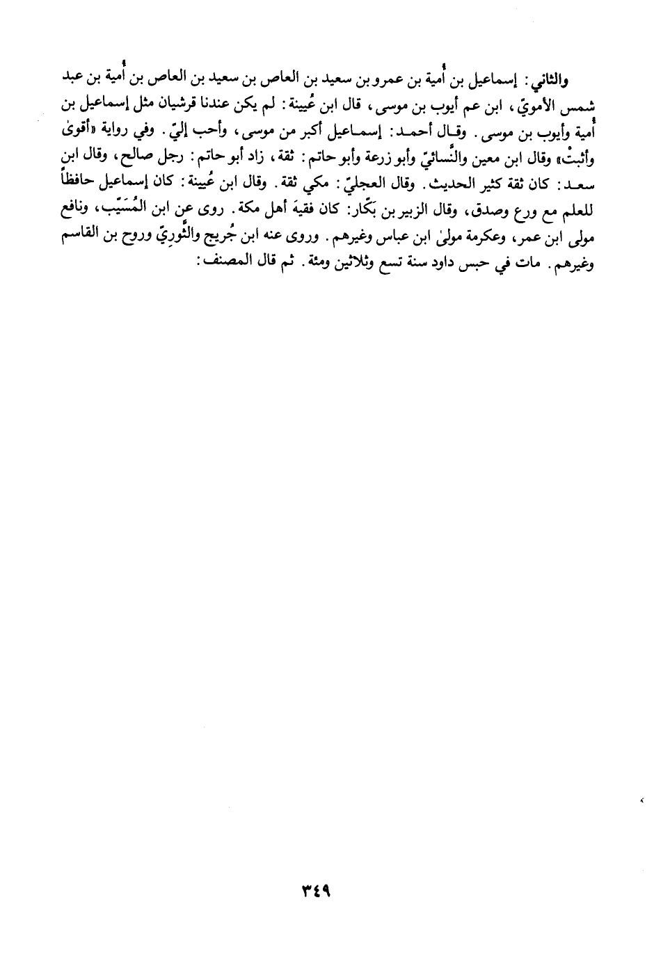 والثاني: إسماعيل بن أُمية بن عمرو بن سعيد بن العاص بن سعيد بن العاص بن أُمية بن عبد شمس الأمويّ، ابن عم أيوب بن موسى، قال ابن عُيينة: لم يكن عندنا قرشيان مثل إسماعيل بن أُمية وأيوب بن موسى. وقال أحمد: إسماعيل أكبر من موسى، وأحب إليّ. وفي رواية "أقوى وأثبتْ" وقال ابن معين والنَّسائيّ وأبو زرعة وأبو حاتم: ثقة، زاد أبو حاتم: رجل صالح، وقال ابن سعد: كان ثقة كثير الحديث. وقال العجليّ: مكي ثقة. وقال ابن عُيينة: كان إسماعيل حافظًا للعلم مع ورع وصدق، وقال الزبير بن بَكّار: كان فقيهَ أهل مكة. روى عن ابن المُسَيّب، ونافع مولى ابن عمر، وعكرمة مولى ابن عباس وغيرهم. وروى عنه ابن جُريج والثَّورِيّ وروح بن القاسم وغيرهم. مات في حبس داود سنة تسع وثلاثين ومئة. ثم قال المصنف: