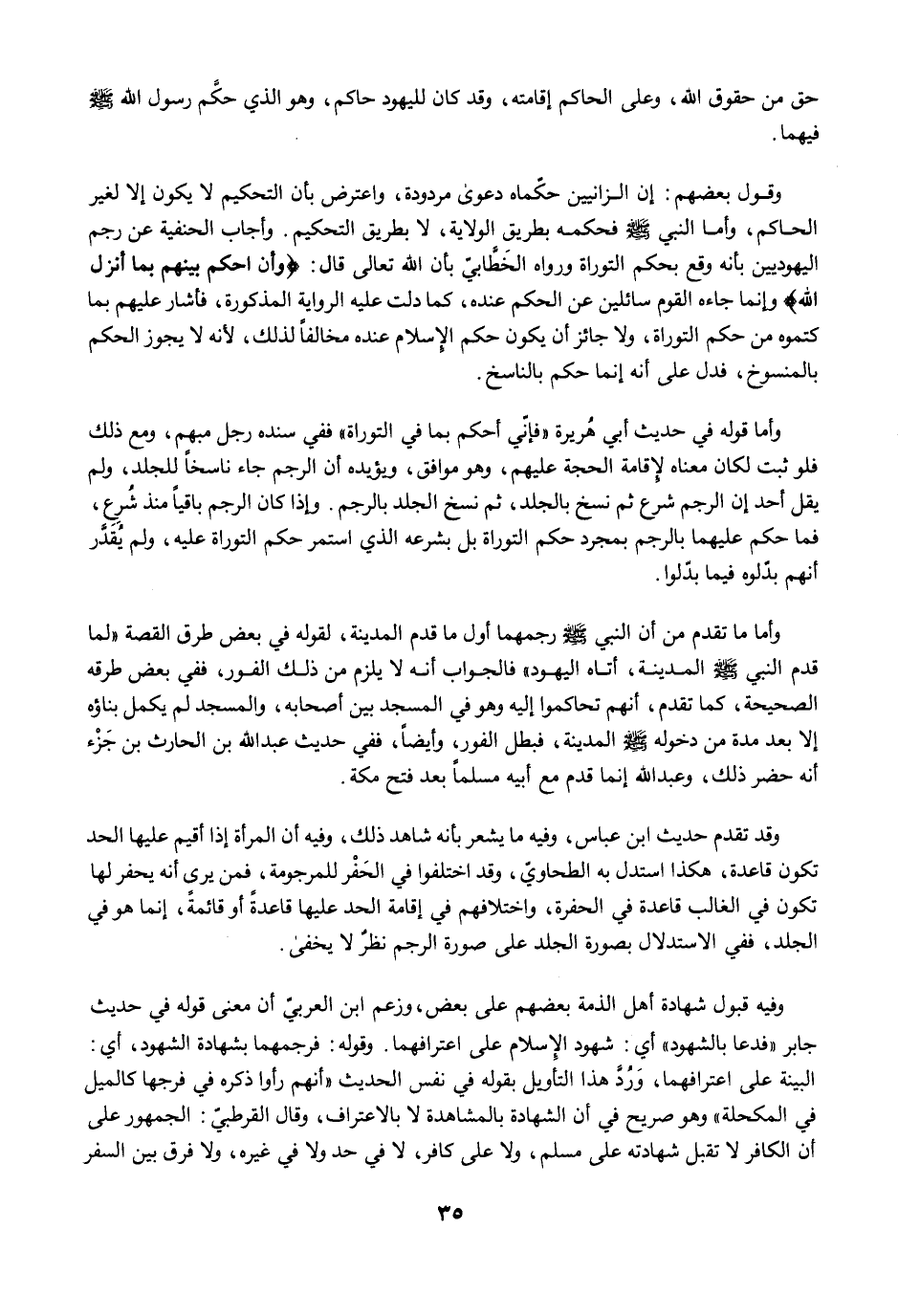 وقول بعضهم: إن الزانيين حكّماه دعوى مردودة، واعترض بأن التحكيم لا يكون إلا لغير الحاكم، وأما النبي -صلى الله عليه وسلم- فحكمه بطريق الولاية، لا بطريق التحكيم. وأجاب الحنفية عن رجم اليهوديين بأنه وقع بحكم التوراة ورواه الخَطَّابيّ بأن الله تعالى قال: {وَأَنِ احْكُمْ بَيْنَهُمْ بِمَا أَنْزَلَ اللَّهُ} وإنما جاءه القوم سائلين عن الحكم عنده، كما دلت عليه الرواية المذكورة، فأشار عليهم بما كتموه من حكم التوراة، ولا جائز أن يكون حكم الإِسلام عنده مخالفًا لذلك, لأنه لا يجوز الحكم بالمنسوخ، فدل على أنه إنما حكم بالناسخ.