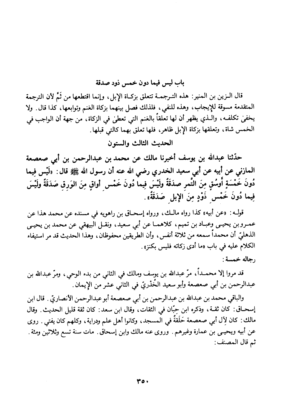حَدَّثَنَا عَبْدُ اللَّهِ بْنُ يُوسُفَ أَخْبَرَنَا مَالِكٌ عَنْ مُحَمَّدِ بْنِ عَبْدِ الرَّحْمَنِ بْنِ أَبِي صَعْصَعَةَ الْمَازِنِيِّ عَنْ أَبِيهِ عَنْ أَبِي سَعِيدٍ الْخُدْرِيِّ رضي الله عنه أَنَّ رَسُولَ اللَّهِ -صلى الله عليه وسلم- قَالَ: "لَيْسَ فِيمَا دُونَ خَمْسَةِ أَوْسُقٍ مِنَ التَّمْرِ صَدَقَةٌ، وَلَيْسَ فِيمَا دُونَ خَمْسِ أَوَاقٍ مِنَ الْوَرِقِ صَدَقَةٌ، وَلَيْسَ فِيمَا دُونَ خَمْسِ ذَوْدٍ مِنَ الإِبِلِ صَدَقَةٌ".