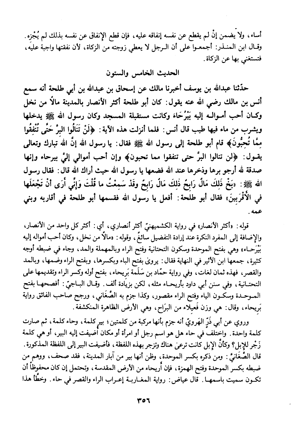حَدَّثَنَا عَبْدُ اللَّهِ بْنُ يُوسُفَ أَخْبَرَنَا مَالِكٌ عَنْ إِسْحَاقَ بْنِ عَبْدِ اللَّهِ بْنِ أَبِي طَلْحَةَ أَنَّهُ سَمِعَ أَنَسَ بْنَ مَالِكٍ رضي الله عنه يَقُولُ: كَانَ أَبُو طَلْحَةَ أَكْثَرَ الأَنْصَارِ بِالْمَدِينَةِ مَالاً مِنْ نَخْلٍ، وَكَانَ أَحَبَّ أَمْوَالِهِ إِلَيْهِ بَيْرُحَاءَ وَكَانَتْ مُسْتَقْبِلَةَ الْمَسْجِدِ، وَكَانَ رَسُولُ اللَّهِ -صلى الله عليه وسلم- يَدْخُلُهَا وَيَشْرَبُ مِنْ مَاءٍ فِيهَا طَيِّبٍ قَالَ أَنَسٌ: فَلَمَّا أُنْزِلَتْ هَذِهِ الآيَةُ {لَنْ تَنَالُوا الْبِرَّ حَتَّى تُنْفِقُوا مِمَّا تُحِبُّونَ} قَامَ أَبُو طَلْحَةَ إِلَى رَسُولِ اللَّهِ -صلى الله عليه وسلم- فَقَالَ يَا رَسُولَ اللَّهِ. إِنَّ اللَّهَ تَبَارَكَ وَتَعَالَى يَقُولُ {لَنْ تَنَالُوا الْبِرَّ حَتَّى تُنْفِقُوا مِمَّا تُحِبُّونَ} وَإِنَّ أَحَبَّ أَمْوَالِي إِلَيَّ بَيْرُحَاءَ، وَإِنَّهَا صَدَقَةٌ لِلَّهِ أَرْجُو بِرَّهَا وَذُخْرَهَا عِنْدَ اللَّهِ، فَضَعْهَا يَا رَسُولَ اللَّهِ حَيْثُ أَرَاكَ اللَّهُ. قَالَ: فَقَالَ رَسُولُ اللَّهِ -صلى الله عليه وسلم-: "بَخْ، ذَلِكَ مَالٌ رَابِحٌ، ذَلِكَ مَالٌ رَابِحٌ، وَقَدْ سَمِعْتُ مَا قُلْتَ وَإِنِّي أَرَى أَنْ تَجْعَلَهَا فِي الأَقْرَبِينَ". فَقَالَ أَبُو طَلْحَةَ: أَفْعَلُ يَا رَسُولَ اللَّهِ. فَقَسَمَهَا أَبُو طَلْحَةَ فِي أَقَارِبِهِ وَبَنِي عَمِّهِ.