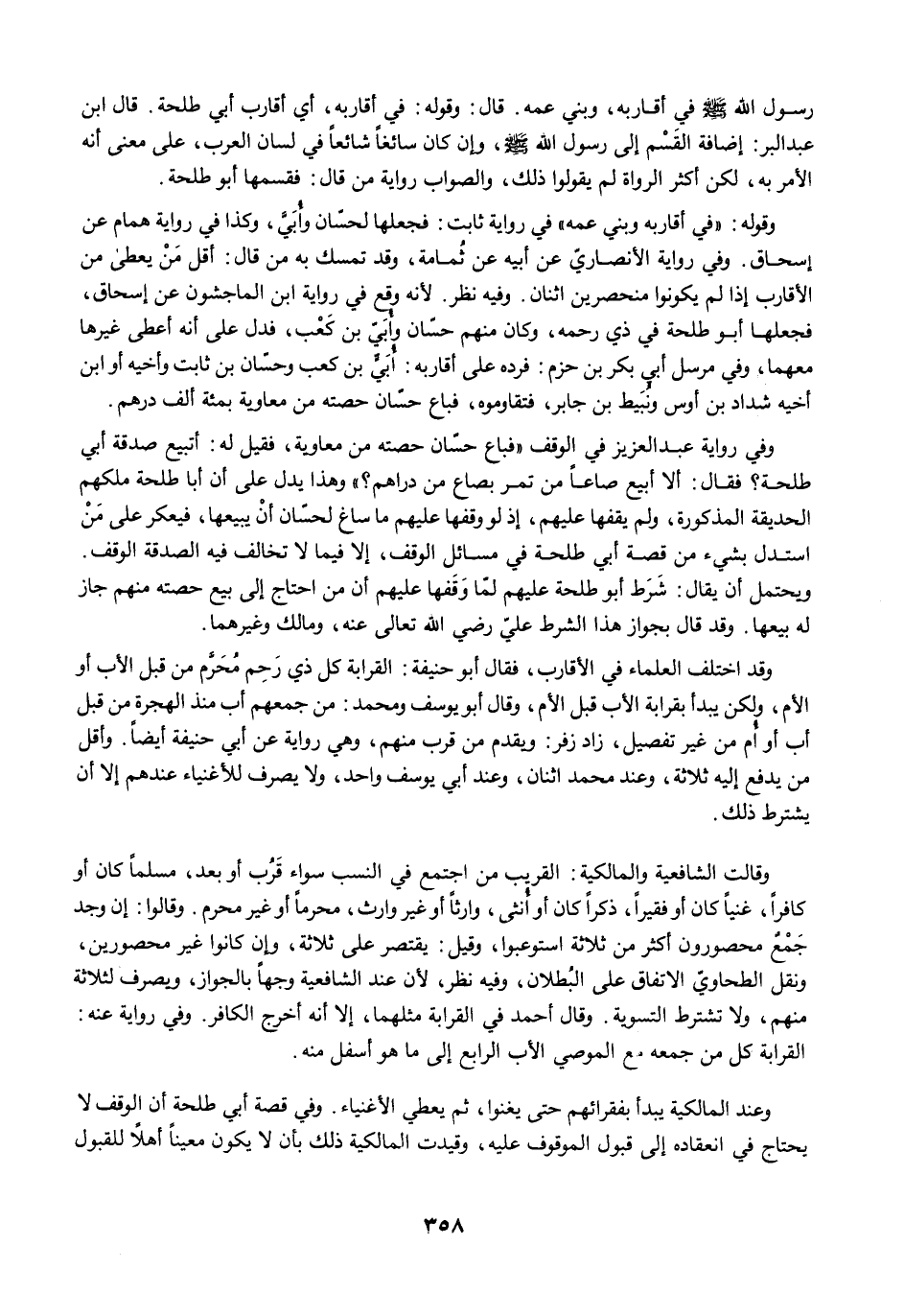 وفي رواية عبد العزيز في الوقف "فباع حسّان حصته من معاوية، فقيل له: أتبيع صدقة أبي طلحة؟ فقال: ألا أبيع صاعًا من تمر بصاع من دراهم؟ " وهذا يدل على أن أبا طلحة ملكهم الحديقة المذكورة، ولم يقفها عليهم، إذ لو وقفها عليهم ما ساغ لحسّان أنْ يبيعها، فيعكر على مَنْ استدل بشيء من قصة أبي طلحة في مسائل الوقف، إلا فيما لا تخالف فيه الصدقة الوقف. ويحتمل أن يقال: شَرَط أبو طلحة عليهم لمّا وَقَفها عليهم أن من احتاج إلى بيع حصته منهم جاز له بيعها. وقد قال بجواز هذا الشرط على رضي الله تعالى عنه، ومالك وغيرهما.