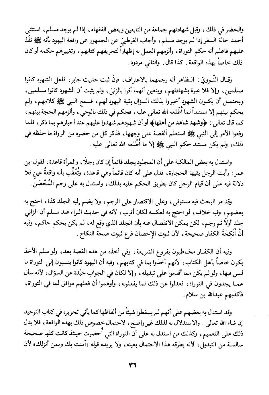 وقال النّوويّ: الظاهر أنه رجمهما بالاعتراف، فإنْ ثبت حديث جابر، فلعل الشهود كانوا مسلمين، وإلا فلا عبرة بشهادتهم، ويعين أنهما أقرا بالزنى، ولم يثبت أن الشهود كانوا مسلمين، ويحتمل أن يكون الشهود أخبروا بذلك السؤال بقية اليهود لهم، فسمع النبي -صلى الله عليه وسلم- كلامهم، ولم يحكم بينهم إلا مستندًا لما أَطْلعه الله تعالى عليه، فحكم في ذلك بالوحي، وألزمهم الحجة بينهم، كما قال تعالى: {وَشَهِدَ شَاهِدٌ مِنْ أَهْلِهَا} أو أن شهودهم شهدوا عليهم عند أحبارهم بما ذكر، فلما رفعوا الأمر إلى النبي -صلى الله عليه وسلم- استعلم القصة على وجهها، فذكر كل من حضره من الرواة ما حفظه في ذلك، ولم يكن مستند حكم النبي -صلى الله عليه وسلم- إلا ما أَطْلعه الله تعالى عليه.
