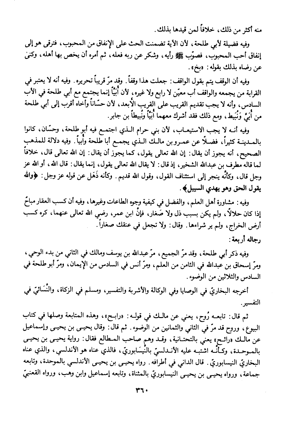 وفيه أن الوقف يتم بقول الواقف: جعلت هذا وقفًا. وقد مرّ قريبًا تحريره. وفيه أنه لا يعتبر في القرابة من يجمعه والواقف أب معيّن لا رابع ولا غيره؛ لأن أُبَيَّاً إنما يجتمع مع أبي طلحة في الأب السادس، وأنه لا يجب تقديم القريب على القريب الأَبعد، لأن حسّانًا وأخاه أقرب إلى أبي طلحة من أُبَيَّ وَنُبَيط، ومع ذلك فقد أشرك معهما أبَيَّاً ونُبيطًا بن جابر.