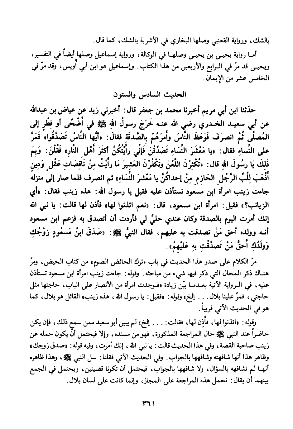 حَدَّثَنَا ابْنُ أَبِي مَرْيَمَ أَخْبَرَنَا مُحَمَّدُ بْنُ جَعْفَرٍ قَالَ: أَخْبَرَنِي زَيْدٌ عَنْ عِيَاضِ بْنِ عَبْدِ اللَّهِ عَنْ أَبِي سَعِيدٍ الْخُدْرِيِّ رضي الله عنه خَرَجَ رَسُولُ اللَّهِ -صلى الله عليه وسلم- فِي أَضْحًى أَوْ فِطْرٍ إِلَى الْمُصَلَّى ثُمَّ انْصَرَفَ فَوَعَظَ النَّاسَ وَأَمَرَهُمْ بِالصَّدَقَةِ فَقَالَ: "أَيُّهَا النَّاسُ تَصَدَّقُوا". فَمَرَّ عَلَى النِّسَاءِ فَقَالَ: "يَا مَعْشَرَ النِّسَاءِ تَصَدَّقْنَ، فَإِنِّي رَأَيْتُكُنَّ أَكْثَرَ أَهْلِ النَّارِ". فَقُلْنَ: وَبِمَ ذَلِكَ يَا رَسُولَ اللَّهِ قَالَ: "تُكْثِرْنَ اللَّعْنَ وَتَكْفُرْنَ الْعَشِيرَ، مَا رَأَيْتُ مِنْ نَاقِصَاتِ عَقْلٍ وَدِينٍ أَذْهَبَ لِلُبِّ الرَّجُلِ الْحَازِمِ مِنْ إِحْدَاكُنَّ يَا مَعْشَرَ النِّسَاءِ. ثُمَّ انْصَرَفَ فَلَمَّا صَارَ إِلَى مَنْزِلِهِ جَاءَتْ زَيْنَبُ امْرَأَةُ ابْنِ مَسْعُودٍ تَسْتَأْذِنُ عَلَيْهِ فَقِيلَ يَا رَسُولَ اللَّهِ: هَذِهِ زَيْنَبُ فَقَالَ: "أَيُّ الزَّيَانِبِ؟ ". فَقِيلَ: امْرَأَةُ ابْنِ مَسْعُودٍ. قَالَ: "نَعَمِ ائْذَنُوا لَهَا". فَأُذِنَ لَهَا قَالَتْ: يَا نَبِيَّ اللَّهِ إِنَّكَ أَمَرْتَ الْيَوْمَ بِالصَّدَقَةِ، وَكَانَ عِنْدِي حُلِيٌّ لِي، فَأَرَدْتُ أَنْ أَتَصَدَّقَ بِهِ، فَزَعَمَ ابْنُ مَسْعُودٍ أَنَّهُ وَوَلَدَهُ أَحَقُّ مَنْ تَصَدَّقْتُ بِهِ عَلَيْهِمْ. فَقَالَ النَّبِيُّ -صلى الله عليه وسلم-: "صَدَقَ ابْنُ مَسْعُودٍ، زَوْجُكِ وَوَلَدُكِ أَحَقُّ مَنْ تَصَدَّقْتِ بِهِ عَلَيْهِمْ".