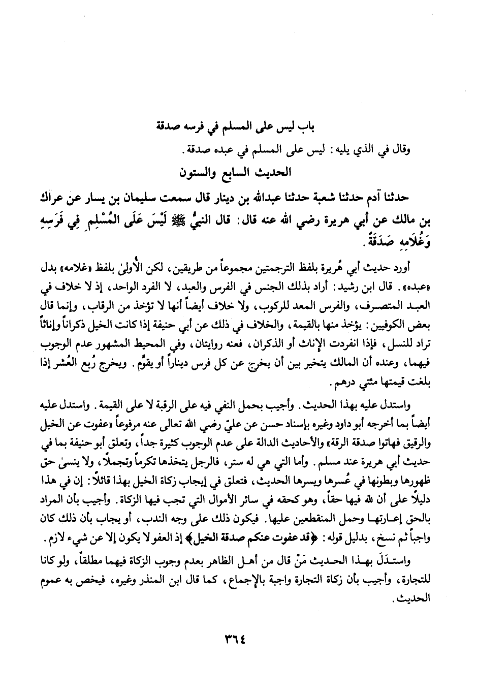 أورد حديث أبي هُريرة بلفظ الترجمتين مجموعًا من طريقين، لكن الأُولى بلفظ "غلامه" بدل "عبده". قال ابن رشيد: أراد بذلك الجنس في الفرس والعبد، لا الفرد الواحد، إذ لا خلاف في العبد المتصرف، والفرس المعد للركوب، ولا خلاف أيضًا أنها لا تؤخذ من الرقاب، وإنما قال بعض الكوفيين: يؤخذ منها بالقيمة، والخلاف في ذلك عن أبي حنيفة إذا كانت الخيل ذكرانًا وإناثًا تراد للنسل، فإذا انفردت الإناث أو الذكران، فعنه روايتان، وفي المحيط المشهور عدم الوجوب فيهما، وعنده أن المالك يتخير بين أن يخرج عن كل فرس دينارًا أو يقوَّم. ويخرج رُبع العُشر إذا بلغت قيمتها مئتي درهم.