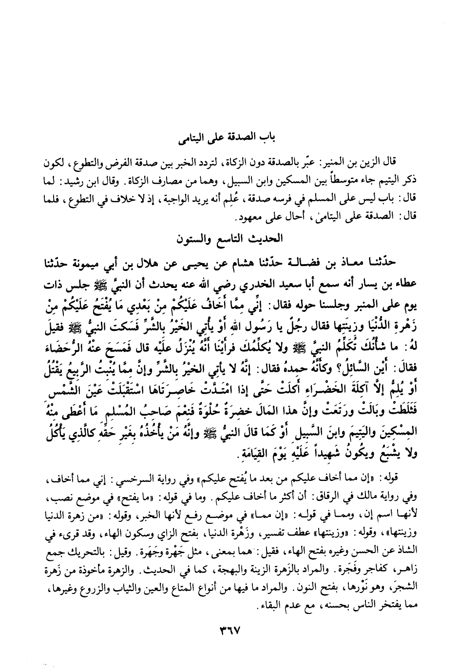 قال الزين بن المنير: عبّر بالصدقة دون الزكاة، لتردد الخبر بين صدقة الفرض والتطوع، لكون ذكر اليتيم جاء متوسطاً بين المسكين وابن السبيل، وهما من مصارف الزكاة. وقال ابن رشيد: لما قال: باب ليس على المسلم في فرسه صدقة، عُلِم أنه يريد الواجبة، إذ لا خلاف في التطوع، فلما قال: الصدقة على اليتامى، أحال على معهود.