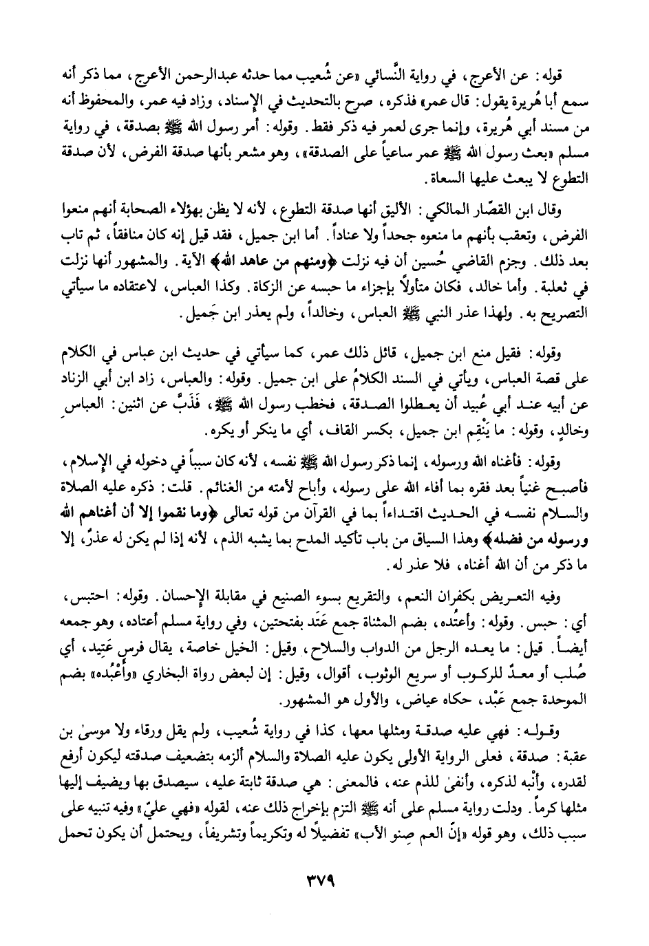 قوله: عن الأعرج، في رواية النَّسائي "عن شُعيب مما حدثه عبد الرحمن الأعرج، مما ذكر أنه سمع أبا هُريرة يقول: قال عمر" فذكره، صرح بالتحديث في الإسناد، وزاد فيه عمر، والمحفوظ أنه من مسند أبي هُريرة، وإنما جرى لعمر فيه ذكر فقط. وقوله: أمر رسول الله -صلى الله عليه وسلم- بصدقة، في رواية مسلم "بعث رسول الله -صلى الله عليه وسلم- عمر ساعيًا على الصدقة"، وهو مشعر بأنها صدقة الفرض، لأن صدقة التطوع لا يبعث عليها السعاة.
