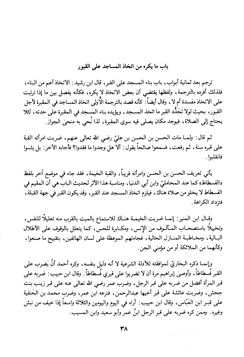 ترجم بعد ثمانية أبواب، باب بناء المسجد على القبر، قال ابن رشيد: الاتخاذ أعم من البناء، فلذلك أفرده بالترجمة، ولفظها يقتضي أن بعض الاتخاذ لا يكره، فكأنه يفصل بين ما إذا ترتبت على الاتخاذ مفسدة أم لا، وقال أيضًا: كأنه قصد بالترجمة الأُولى اتخاذ المساجد في المقبرة لأجل القبور، بحيث لولا تَجَدُّد القبر ما اتخذ المسجد، ويؤيده بناء المسجد في المقبرة على حدته، لئلا يحتاج إلى الصلاة، فيوجد مكان يصلى فيه سوى المقبرة، لذا نُحي به منحى الجواز.