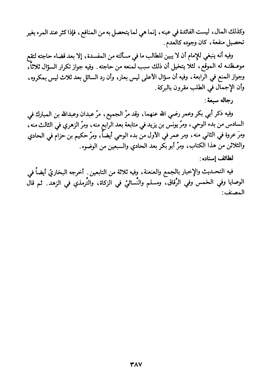 وفيه أنه ينبغي للإمام أن لا يبين للطالب ما في مسألته من المفسدة، إلا بعد قضاء حاجته لتقع موعظته له الموقع، لئلا يتخيل أن ذلك سبب لمنعه من حاجته. وفيه جواز تكرار السؤال ثلاثًا، وجواز المنع في الرأبعة، وفيه أن سؤال الأعلى ليس بعار، وأن رد السائل بعد ثلاث ليس بمكروه، وأن الإجمال الذي الطلب مقرون بالبركة.