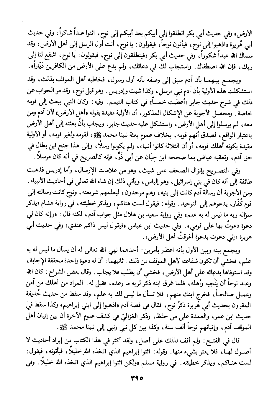 وفي التصريح بإنزال الصحف على شيث، وهو من علامات الإِرسال، وأما إدريس فذهبت طائفة إلى أنه كان في بني إسرائيل، وهو إلياس، ويأتي ذلك إن شاء الله تعالى في أحاديث الأنبياء. ومن الأجوبة أن رسالة آدم كانت إلى بنيه، وهم موحدون، ليعلمهم شريعته، ونوح كانت رسالته إلى قوم كُفّار، يدعوهم إلى التوحيد. وقوله: فيقول لست هناكم، ويذكر خطيئته، في رواية هشام "يذكر سؤاله ربه ما ليس له به علم" وفي رواية سعيد بن هلال مثل جواب آدم، لكنه قال: "وإنه كان لي دعوة دعوتُ بها على قومي". وفي حديث ابن عباس "فيقول ليس ذاكم عندي" وفي حديث أبي هريرة "إني دعوت بدعوة أغرقتْ أهل الأرض".