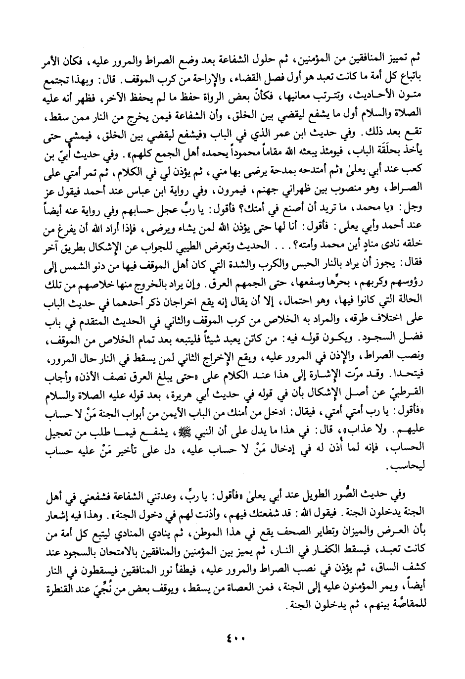 ثم تمييز المنافقين من المؤمنين، ثم حلول الشفاعة بعد وضع الصراط والمرور عليه، فكأن الأمر باتباع كل أمة ما كانت تعبد هو أول فصل القضاء، والإراحة من كرب الموقف. قال: وبهذا تجتمع متون الأحاديث، وتترتب معانيها، فكأنّ بعض الرواة حفظ ما لم يحفظ الآخر، فظهر أنه عليه الصلاة والسلام أول ما يشفع ليقضي بين الخلق، وأن الشفاعة فيمن يخرج من النار ممن سقط، تقع بعد ذلك. وفي حديث ابن عمر الذي في الباب "فيشفع ليقضي بين الخلق، فيمشي حتى يأخذ بحلَقَة الباب، فيومئذ يبعثه الله مقامًا محمودًا يحمده أهل الجمع كلهم". وفي حديث أُبيّ بن كعب عند أبي يعلى "ثم أمتدحه بمدحة يرضى بها مني، ثم يؤذن لي في الكلام، ثم تمر أمتي على الصراط، وهو منصوب بين ظهراني جهنم، فيمرون، وفي رواية ابن عباس عند أحمد فيقول عز وجل: "يا محمد، ما تريد أن أصنع في أمتك؟ فأقول: يا ربِّ عجل حسابهم وفي رواية عنه أيضًا عند أحمد وأبي يعلى: فأقول: أنا لها حتى يؤذن الله لمن يشاء ويرضى، فإذا أراد الله أن يفرغ من خلقه نادى منادٍ أين محمد وأمته؟ ... الحديث وتعرض الطيبي للجواب عن الإشكال بطريق آخر فقال: يجوز أن يراد بالنار الحبس والكرب والشدة التي كان أهل الموقف فيها من دنو الشمس إلى رؤوسهم وكربهم، بحرِّها وسفعها، حتى الجمهم العرق. وإن يراد بالخروج منها خلاصهم من تلك الحالة التي كانوا فيها، وهو احتمال، إلا أن يقال إنه يقع اخراجان ذكر أحدهما في حديث الباب على اختلاف طرقه، والمراد به الخلاص من كرب الموقف والثاني في الحديث المتقدم في باب فضل السجود. ويكون قوله فيه: من كاتن يعبد شيئًا فليتبعه بعد تمام الخلاص من الموقف، ونصب الصراط، والإذن في المرور عليه، ويقع الإخراج الثاني لمن يسقط في النار حال المرور، فيتحدا. وقد مرّت الإشارة إلى هذا عند الكلام على "حتى يبلغ العرق نصف الأذن" وأجاب القرطبيّ عن أصل الإشكال بأن في قوله في حديث أبي هريرة، بعد قوله عليه الصلاة والسلام "فأقول: يا رب أمتي أمتي، فيقال: ادخل من أمنك من الباب الأيمن من أبواب الجنة مَنْ لا حساب عليهم. ولا عذاب"، قال: في هذا ما يدل على أن النبي -صلى الله عليه وسلم-، يشفع فيما طلب من تعجيل الحساب، فإنه لما أُذن له في إدخال مَنْ لا حساب عليه، دل على تأخير مَنْ عليه حساب ليحاسب.