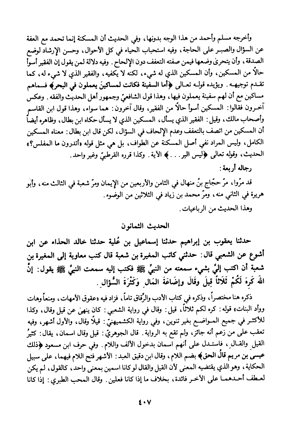 وأخرجه مسلم وأحمد من هذا الوجه بدونها، وفي الحديث أن المسكنة إنما تحمد مع العفة عن السؤال والصبر على الحاجة، وفيه استحباب الحياء في كل الأحوال، وحسن الإرشاد لوضع الصدقة، وأن يتحرى وضعها فيمن صفته التعفف دون الإلحاح. وفيه دلالة لمن يقول إن الفقير أسوأ حالًا من المسكين، وأن المسكين الذي له شيء، لكنه لا يكفيه، والفقير الذي لا شيء له، كما تقدم توجيهه. ويؤيده قوله تعالى {أَمَّا السَّفِينَةُ فَكَانَتْ لِمَسَاكِينَ يَعْمَلُونَ فِي الْبَحْرِ} فسماهم مساكين مع أن لهم سفينة يعملون فيها، وهذا قول الشافعيّ وجمهور أهل الحديث والفقه. وعكس آخرون فقالوا: المسكين أسوأ حالًا من الفقير، وقال آخرون: هما سواء، وهذا قول ابن القاسم وأصحاب مالك، وقيل: الفقير الذي يسأل، المسكين الذي لا يسأل حكاه ابن بطال، وظاهره أيضًا أن المسكين من اتصف بالتعفف وعدم الإلحاف في السؤال، لكن قال ابن بطال: معناه المسكين الكامل، وليس المراد نفي أصل المسكنة عن الطواف، بل هي مثل قوله "أتدرون ما المفلس؟ " الحديث، وقوله تعالى {لَيْسَ الْبِرَّ ...} الآية. وكذا قرره القرطبيّ وغير واحد.