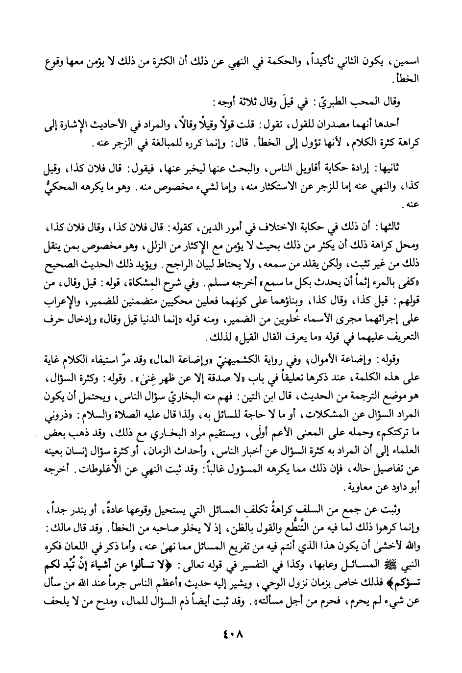 ثالثها: أن ذلك في حكاية الاختلاف في أمور الدين، كقوله: قال فلان كذا، وقال فلان كذا، ومحل كراهة ذلك أن يكثر من ذلك بحيث لا يؤمن مع الإكثار من الزلل، وهو مخصوص بمن ينقل ذلك من غير تثبت، ولكن يقلد من سمعه، ولا يحتاط لبيان الراجح. ويؤيد ذلك الحديث الصحيح "كفى بالمرء إثمًا أن يحدث بكل ما سمع" أخرجه مسلم. وفي شرح المِشكاة، قوله: قيل وقال، من قولهم: قيل كذا، وقال كذا، وبناؤهما على كونهما فعلين محكيين متضمنين للضمير، والإعراب على إجرائهما مجرى الأسماء خلوين من الضمير، ومنه قوله "إنما الدنيا قيل وقال" وإدخال حرف التعريف عليهما في قوله "ما يعرف القال القيل" لذلك.