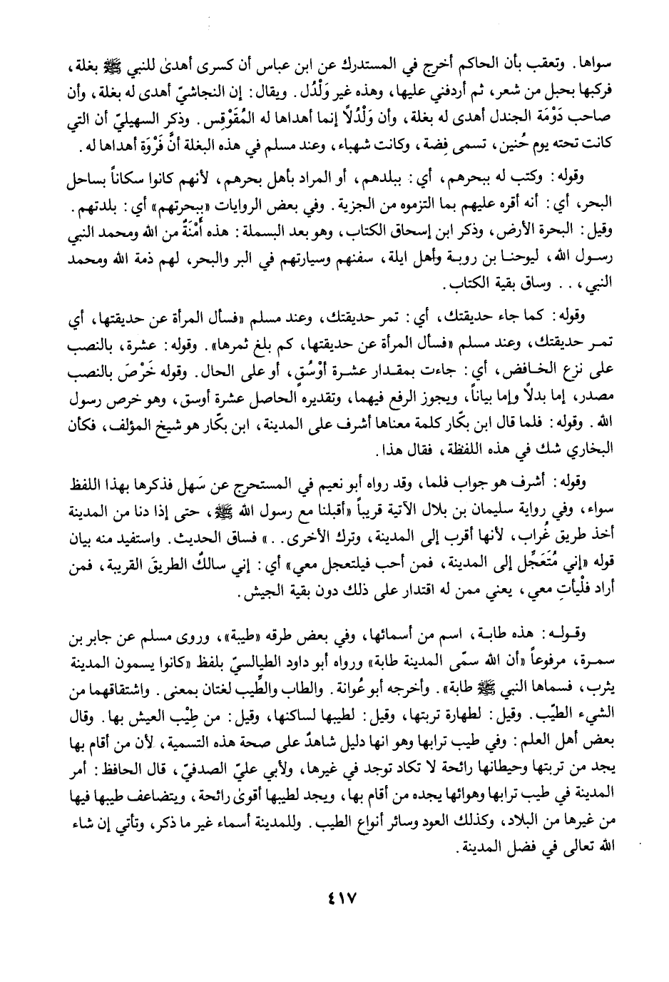 وقوله: وكتب له ببحرهم، أي: ببلدهم، أو المراد بأهل بحرهم؛ لأنهم كانوا سكانًا بساحل البحر، أي: أنه أقره عليهم بما التزموه من الجزية. وفي بعض الروايات "ببحرتهم" أي: بلدتهم. وقيل: البحرة الأرض، وذكر ابن إسحاق الكتاب، وهو بعد البسملة: هذه أَمنَةٌ من الله ومحمد النبي رسول الله، ليوحنا بن روبة وأهل ايلة، سفنهم وسيارتهم في البر والبحر، لهم ذمة الله ومحمد النبي، .. وساق بقية الكتاب.