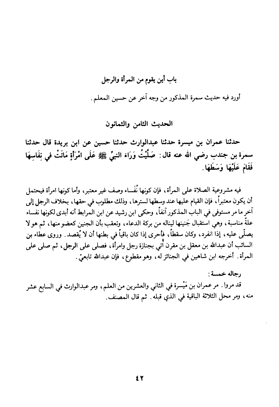 حَدَّثَنَا عِمْرَانُ بْنُ مَيْسَرَةَ حَدَّثَنَا عَبْدُ الْوَارِثِ حَدَّثَنَا حُسَيْنٌ عَنِ ابْنِ بُرَيْدَةَ قال حَدَّثَنَا سَمُرَةُ بْنُ جُنْدُبٍ رضي الله عنه قَالَ: صَلَّيْتُ وَرَاءَ النَّبِيِّ -صلى الله عليه وسلم- عَلَى امْرَأَةٍ مَاتَتْ فِي نِفَاسِهَا فَقَامَ عَلَيْهَا وَسَطَهَا.