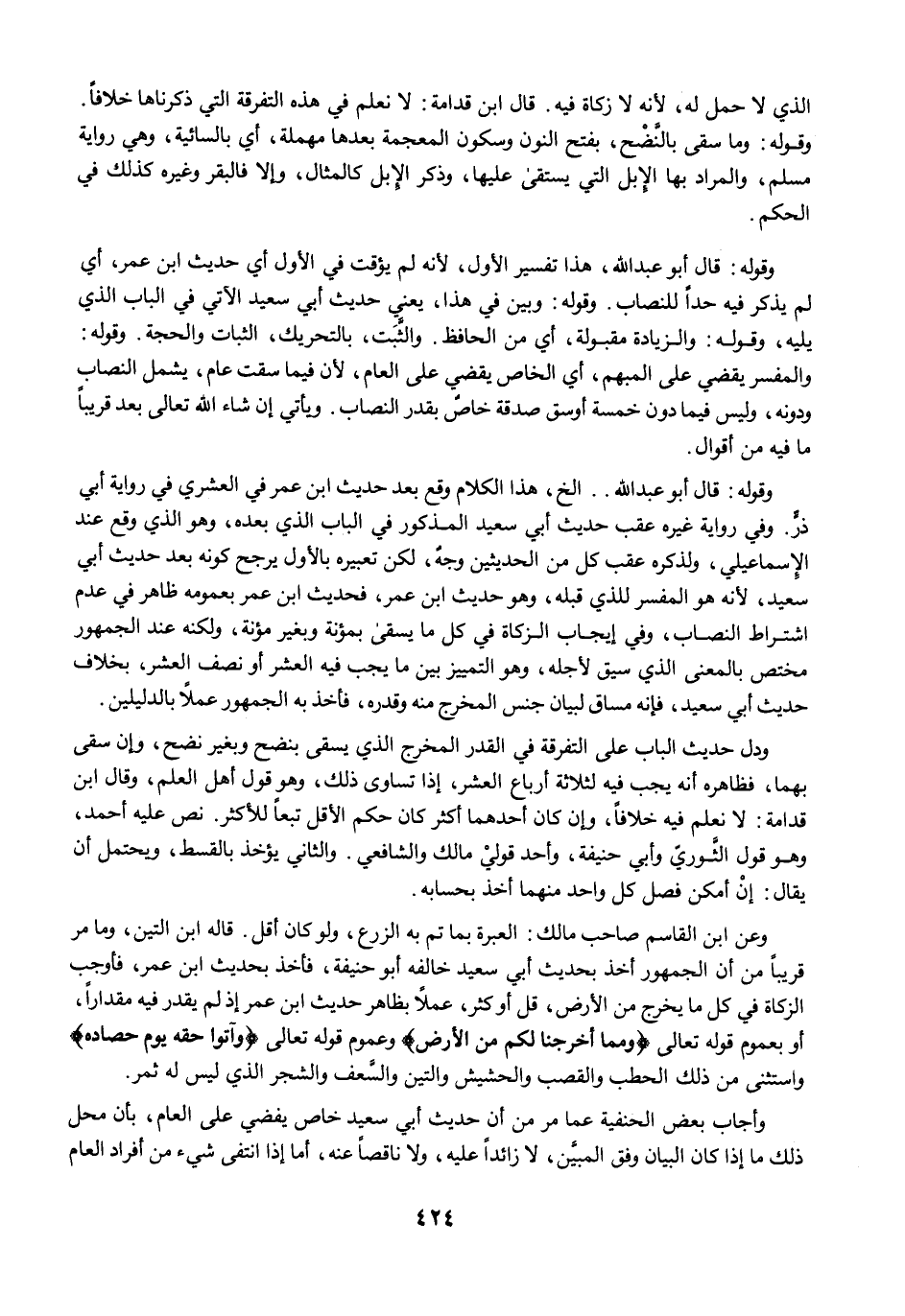 وقوله: قال أبو عبد الله، هذا تفسير الأول، لأنه لم يؤقت في الأول أي حديث ابن عمر، أي لم يذكر فيه حدًا للنصاب. وقوله: وبين في هذا، يعني حديث أبي سعيد الآتي في الباب الذي يليه، وقوله: والزيادة مقبولة، أي من الحافظ. والثَّبَت، بالتحريك، الثبات والحجة. وقوله: والمفسر يقضي على المبهم، أي الخاص يقضي على العام، لأن فيما سقت عام، يشمل النصاب ودونه، وليس فيما دون خمسة أوسق صدقة خاصٌ بقدر النصاب. ويأتي إن شاء الله تعالى بعد قريبًا ما فيه من أقوال.