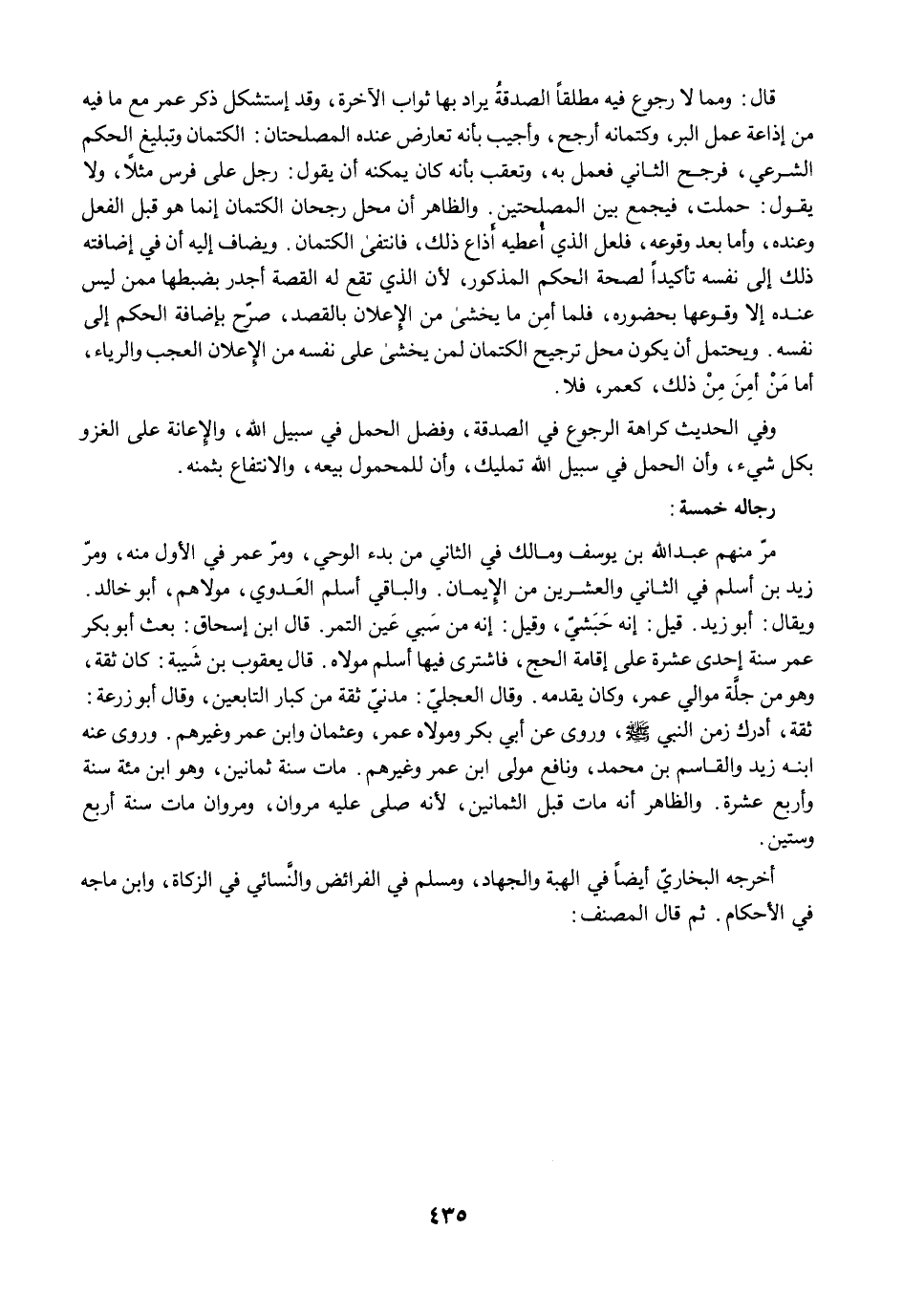 قال: ومما لا رجوع فيه مطلقًا الصدقةُ يراد بها ثواب الآخرة، وقد إستشكل ذكر عمر مع ما فيه من إذاعة عمل البر، وكتمانه أرجح، وأجيب بأنه تعارض عنده المصلحتان: الكتمان وتبليغ الحكم الشرعي، فرجح الثاني فعمل به، وتعقب بأنه كان يمكنه أن يقول: رجل على فرس مثلًا، ولا يقول: حملت، فيجمع بين المصلحتين. والظاهر أن محل رجحان الكتمان إنما هو قبل الفعل وعنده، وأما بعد وقوعه، فلعل الذي أُعطيه أَذاع ذلك، فانتفى الكتمان. ويضاف إليه أن في إضافته ذلك إلى نفسه تأكيدًا لصحة الحكم المذكور، لأن الذي تقع له القصة أجدر بضبطها ممن ليس عنده إلا وقوعها بحضوره، فلما أمِن ما يخشى من الإعلان بالقصد، صرّح بإضافة الحكم إلى نفسه. ويحتمل أن يكون محل ترجيح الكتمان لمن يخشى على نفسه من الإعلان العجب والرياء، أما مَنْ أمِنَ مِنْ ذلك، كعمر، فلا.