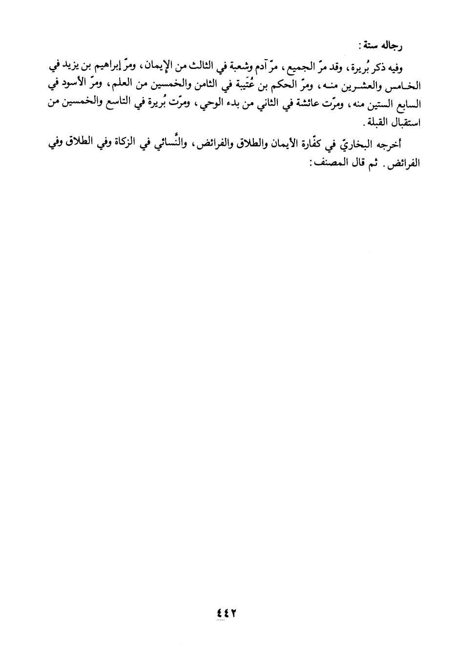 وفيه ذكر بُريرة، وقد مرّ الجميع، مرّ آدم وشعبة في الثالث من الإيمان، ومرّ إبراهيم بن يزيد في الخامس والعشرين منه، ومرّ الحكم بن عُتَيبة في الثامن والخمسين من العلم، ومرّ الأسود في السابع الستين منه، ومرّت عائشة في الثاني من بدء الوحي، ومرّت بُريرة في التاسع والخمسين من استقبال القبلة.
