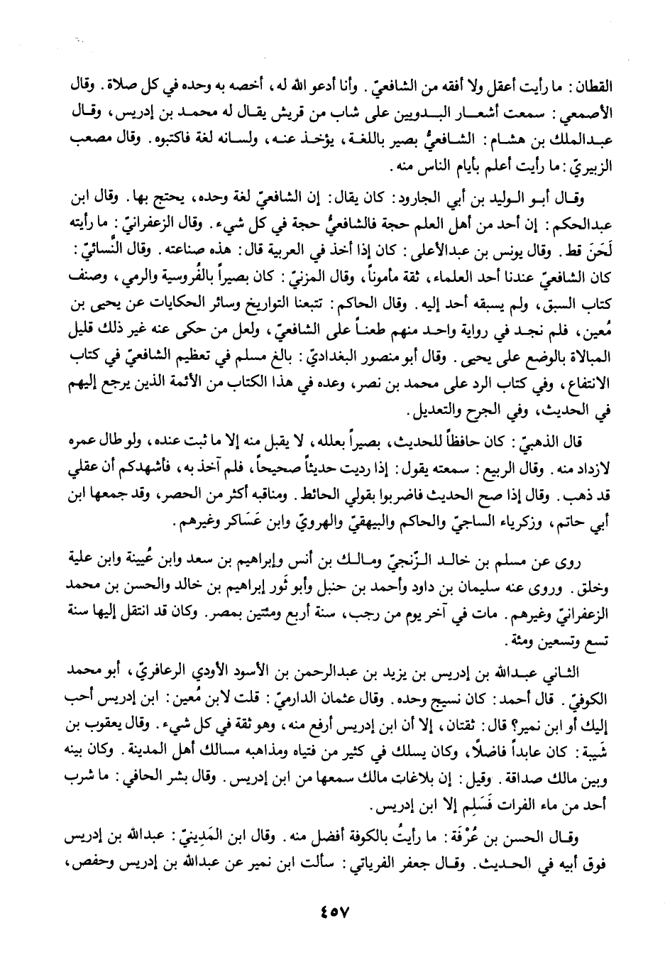 القطان: ما رأيت أعقل ولا أفقه من الشافعيّ. وأنا أدعو الله له، أخصه به وحده في كل صلاة. وقال الأصمعي: سمعت أشعار البدويين على شاب من قريش يقال له محمد بن إدريس، وقال عبد الملك بن هشام: الشافعيُّ بصير باللغة، يؤخذ عنه، ولسانه لغة فاكتبوه. وقال مصعب الزبيريّ: ما رأيت أعلم بأيام الناس منه.