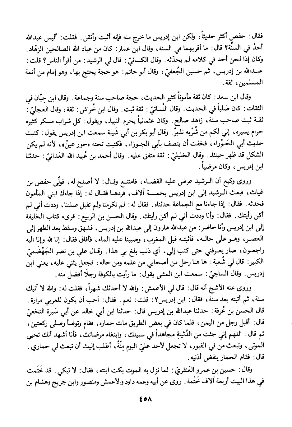 فقال: حفص أكثر حديثًا، ولكن ابن إدريس ما خرج منه فإنه أثبت وأتقن. فقلت: أليس عبد الله أحدَّ في السنَّة؟ قال: ما أقربهما في السنة، وقال ابن عمار: كان من عباد الله الصالحين الزهّاد. وكان إذا لحن أحد في كلامه لم يحدّثه. وقال الكسائيّ: قال لي الرشيد: من أقرأ الناس؟ قلت: عبد الله بن إدريس، ثم حسين الجُعفيّ، وقال أبو حاتم: هو حجة يحتج بها، وهو إمام من أئمة المسلمين، ثقة.