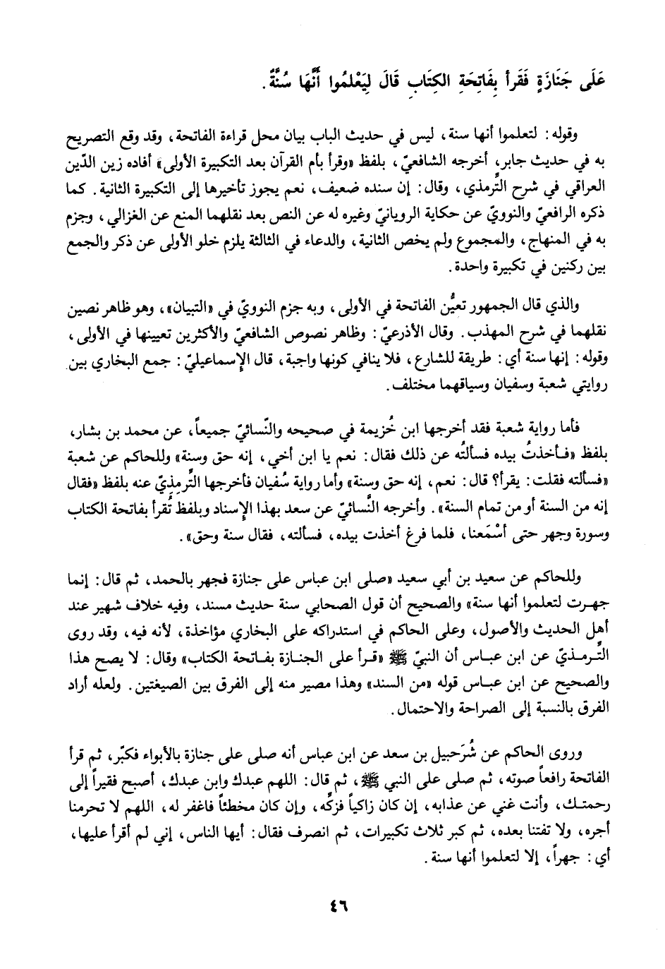 وروى الحاكم عن شُرَحبيل بن سعد عن ابن عباس أنه صلى على جنازة بالأبواء فكبّر، ثم قرأ الفاتحة رافعًا صوته، ثم صلى على النبي -صلى الله عليه وسلم-، ثم قال: اللهم عبدك وابن عبدك، أصبح فقيرًا إلى رحمتك، وأنت غني عن عذابه، إن كان زاكيًا فزكِّه، وإن كان مخطئًا فاغفر له، اللهم لا تحرمنا أجره، ولا تفتنا بعده، ثم كبر ثلاث تكبيرات، ثم انصرف فقال: أيها الناس، إني لم أقرأ عليها، أي: جهرًا، إلا لتعلموا أنها سنة.