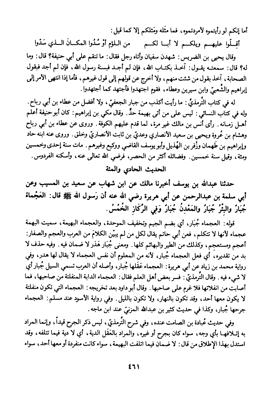وفي حديث عُبادة بن الصامت عنده، وفي شرح التِّرمذيّ، ليس ذكر الجرح قيدًا، وإنما المراد به إتلافها بأي وجه، سواء كان بجرح أو غيره، والمراد بالعَقَل الدية، أي لا دية فيما تتلفه، وقد استدل بهذا الإطلاق من قال: لا ضمان فيما اتلفت البهيمة، سواء كانت منفردة أو معها أحد، سواء