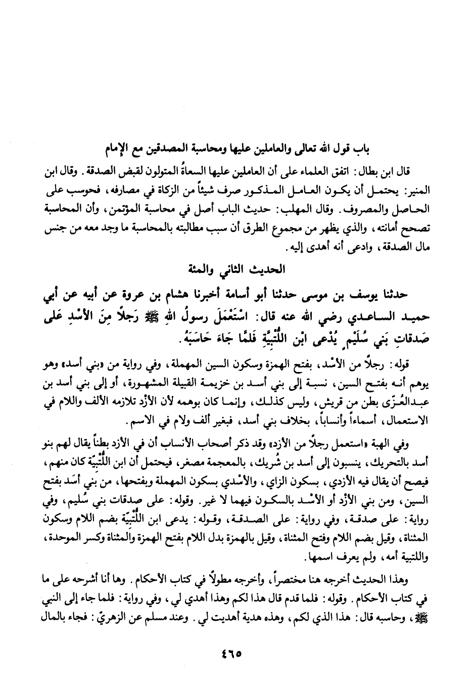حَدَّثَنَا يُوسُفُ بْنُ مُوسَى حَدَّثَنَا أَبُو أُسَامَةَ أَخْبَرَنَا هِشَامُ بْنُ عُرْوَةَ عَنْ أَبِيهِ عَنْ أَبِي حُمَيْدٍ السَّاعِدِيِّ رضي الله عنه قَالَ: اسْتَعْمَلَ رَسُولُ اللَّهِ -صلى الله عليه وسلم- رَجُلاً مِنَ الأَسْدِ عَلَى صَدَقَاتِ بَنِي سُلَيْمٍ يُدْعَى ابْنَ اللُّتْبِيَّةِ، فَلَمَّا جَاءَ حَاسَبَهُ.