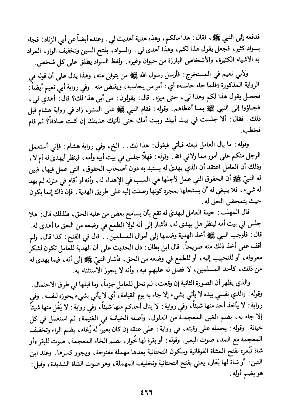 والذي يظهر أن الصورة الثانية إن وقعت، لم تحل للعامل جزمًا، وما قبلها في طرق الاحتمال. وقوله: والذي نفسي بيده لا يأتي بشيء إلا جاء به يوم القيامة، أي لا يأتي بشيء يحوزه لنفسه. وفي رواية: لا يأخذ أحد منها شيئًا، وفي رواية: لا ينال أحدكم منها شيئًا، وفي رواية: لا يَغُل منها شيئًا إلا جاء به، بضم الغين المعجمة من الغلول، وأصله الخيانة في الغنيمة، ثم استعمل في كل خيانة. وقوله: يحمله على رقبته، في رواية: على عنقه إن كان بعيرًا له رُغاء، بضم الراء وتخفيف المعجمة مع المد، صوت البعير. وقوله: أو بقرة لها خُوار، بضم الخاء المعجمة، صوت للبقر "أو شاة تَبْعر" بفتح المثناة الفوقانية وسكون التحتانية بعدها مهملة مفتوحة، ويجوز كسرها. وعند ابن التين: أو شاة لها بَعَار، يعني بفتح التحتانية وتخفيف المهملة، وهو صوت الشاة الشديدة، وقيل: هو بضم أوله.