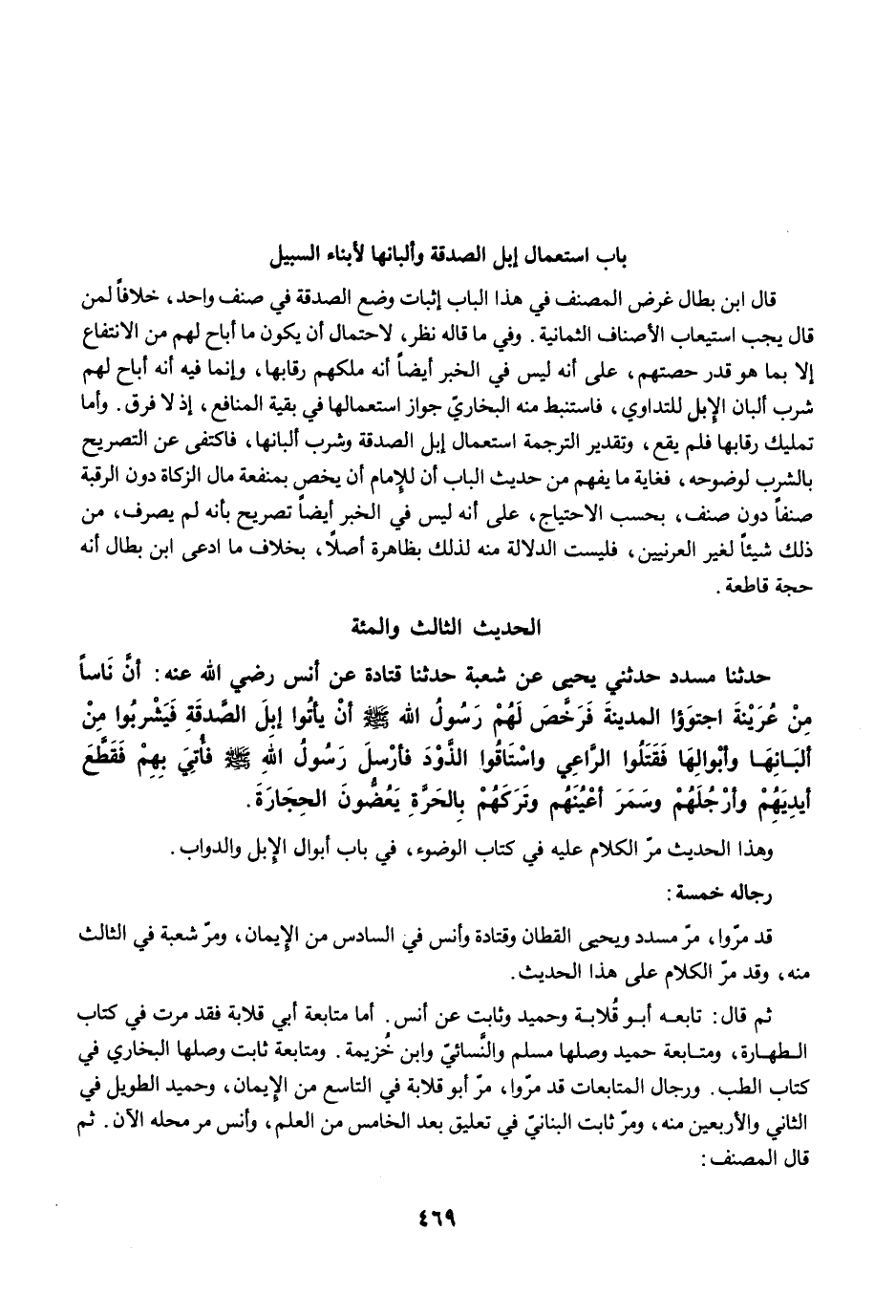 قال ابن بطال غرض المصنف في هذا الباب إثبات وضع الصدقة في صنف واحد، خلافًا لمن قال يجب استيعاب الأصناف الثمانية. وفي ما قاله نظر، لاحتمال أن يكون ما أباح لهم من الانتفاع إلا بما هو قدر حصتهم، على أنه ليس في الخبر أيضًا أنه ملكهم رقابها، وإنما فيه أنه أباح لهم شرب ألبان الإبل للتداوي، فاستنبط منه البخاريّ جواز استعمالها في بقية المنافع، إذ لا فرق. وأما تمليك رقابها فلم يقع، وتقدير الترجمة استعمال إبل الصدقة وشرب ألبانها، فاكتفى عن التصريح بالشرب لوضوحه، فغاية ما يفهم من حديث الباب أن للإمام أن يخص بمنفعة مال الزكاة دون الرقبة صنفًا دون صنف، بحسب الاحتياج، على أنه ليس في الخبر أيضًا تصريح بأنه لم يصرف، من ذلك شيئًا لغير العرنيين، فليست الدلالة منه لذلك بظاهرة أصلًا، بخلاف ما ادعى ابن بطال أنه حجة قاطعة.